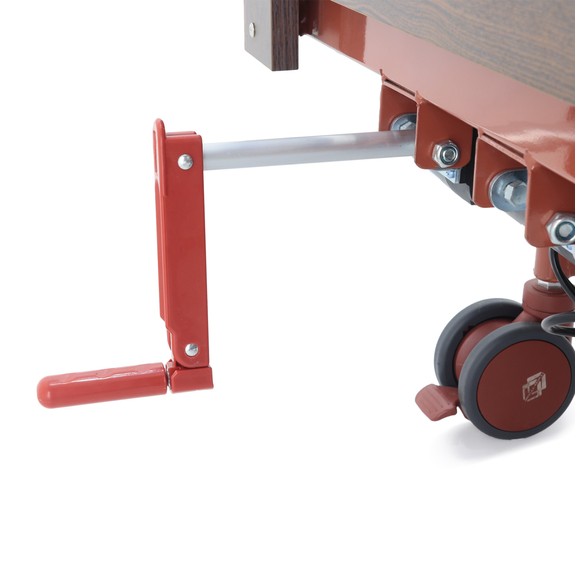 Кровать оснащена 4 двойными колесами Ø117 мм из полиуретана — материал хорошо катится по большинству напольных покрытий и устойчив к износу. Индивидуальные тормоза с блокировкой поворота упрощают надежную фиксацию у постели и повышают безопасность при посадке пациента, уходе и проведении процедур.