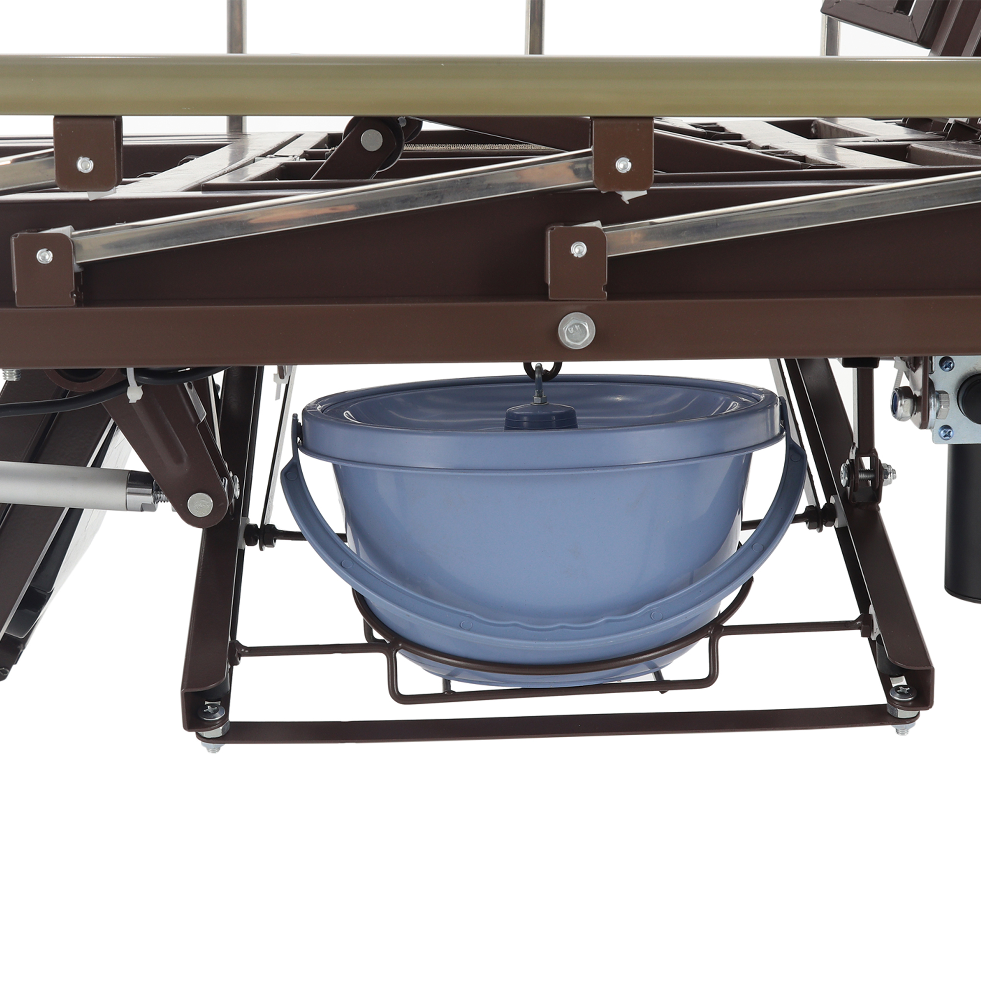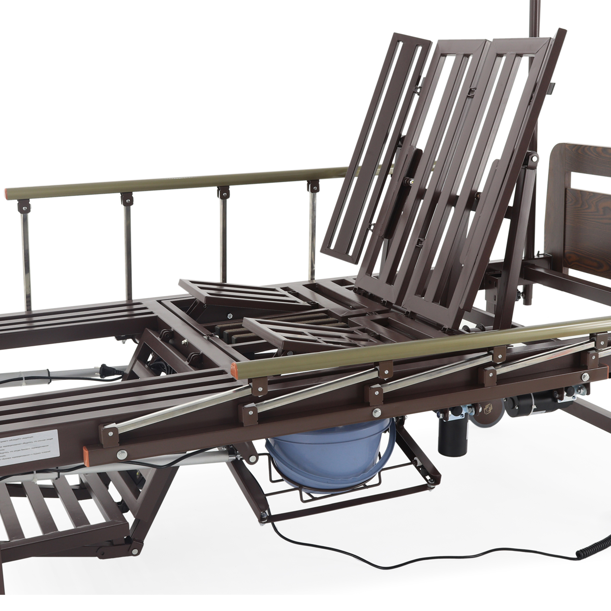 Встроенное туалетное устройство работает от электрического привода и рассчитано на ежедневное использование. Вырез в ложе — 320 × 190 мм, в комплекте предусмотрено судно 325 × 240 × 90 мм. Такое решение особенно ценно, когда пациенту противопоказано вставать или любые перемещения вызывают боль и риск падения.