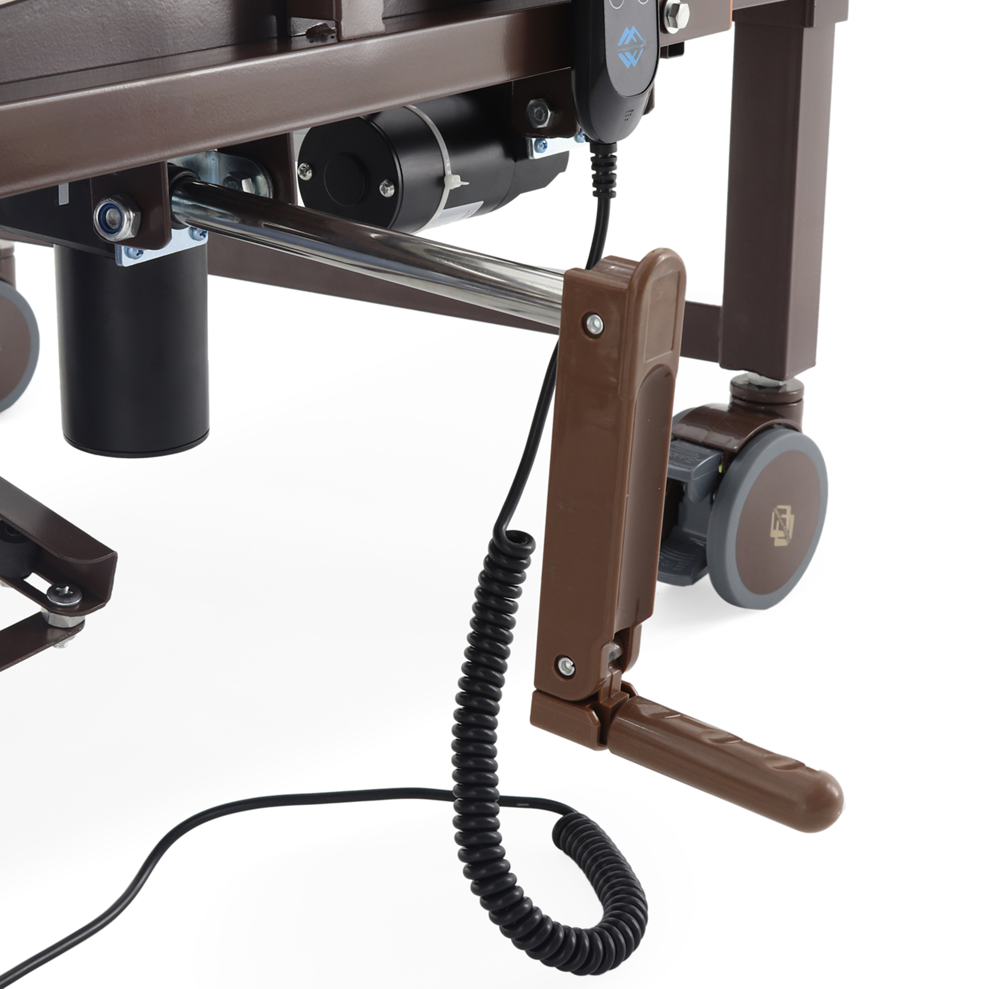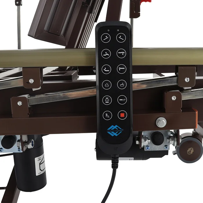 Управление выполняется с пульта пациента с понятными пиктограммами — это снижает порог привыкания и помогает пациенту сохранять самостоятельность. Привод гибридный: электрический с возможностью ручного управления (рукоять в комплекте), что удобно в ситуациях, когда требуется резервный вариант.