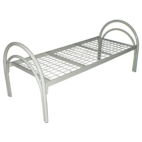 Спинки в виде дуг изготовлены из круглых труб d 32 мм и d 20 мм. Каркас лежака гнутый профиль листового проката покрыт сварной сеткой. Соединение спинок с лежаком – царговое (клин-петля). Металлические поверхности имеют полимерно-порошковое покрытие. Кровать поставляется в разобранном виде.