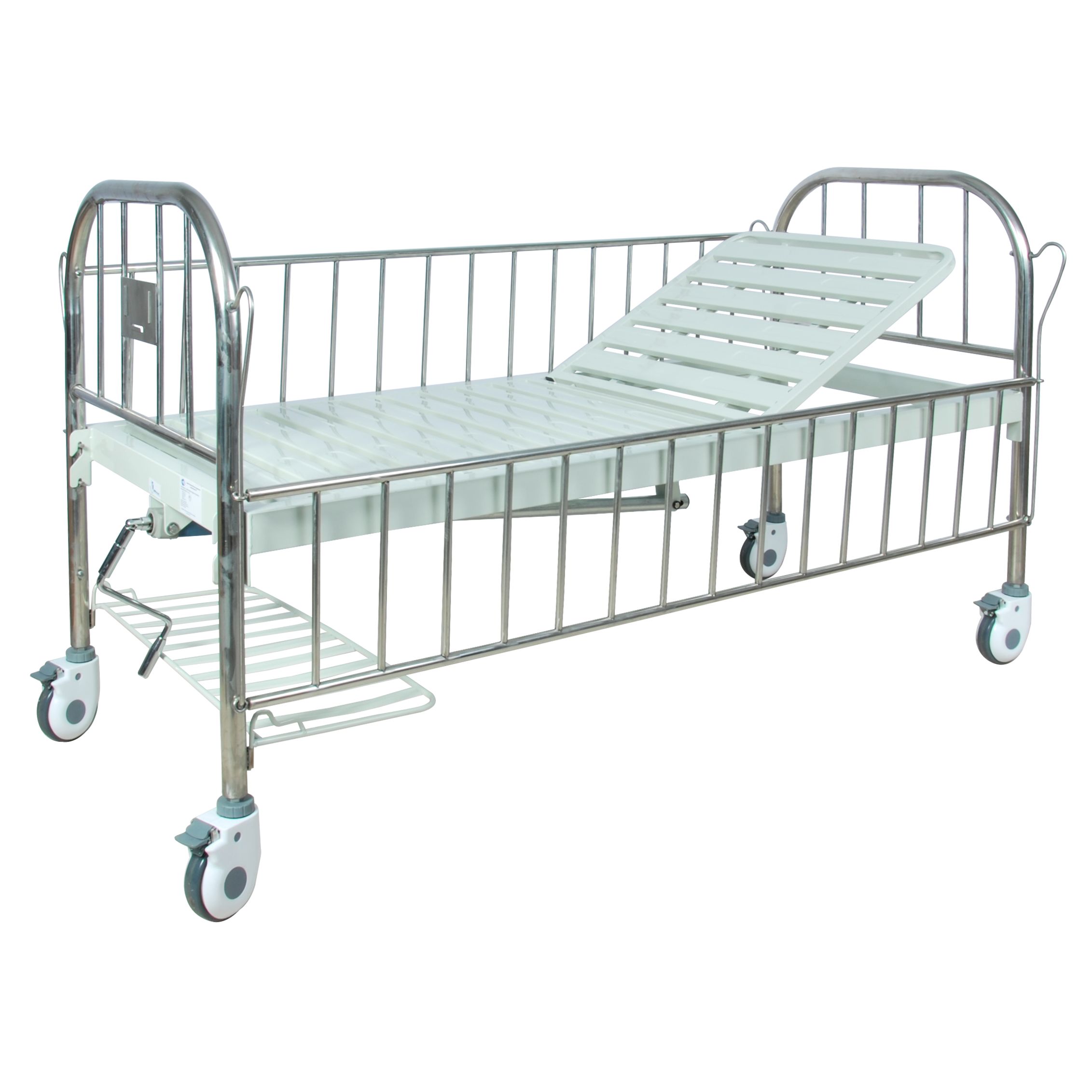 В детской палате важно исключить случайные падения и обеспечить комфортное наблюдение. В модели предусмотрены боковые ограждения (2 шт.) с опускающимся механизмом и двумя фиксированными положениями. За счет 10 вертикальных стоек ограждение получается жестким и «собранным» — оно не выглядит хрупким и сохраняет геометрию при ежедневной эксплуатации.