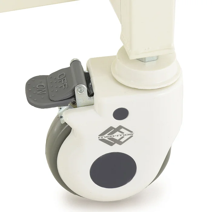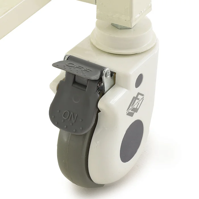 Кровать оснащена четырьмя самоориентирующимися колёсами из немаркого полиуретана с поворотом на 360°. Такая конфигурация удобна для манёвров в коридорах, между тумбами и оборудованием, а также при уборке палаты. Индивидуальный тормоз на каждом колесе обеспечивает надёжную стоянку и одновременно блокирует поворот — кровать меньше «гуляет» при посадке пациента, уходовых процедурах и переносе веса.