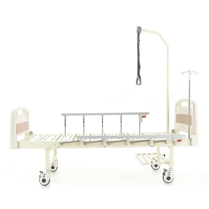 Одинарный каркас предусматривает технологичные точки для оснащения: предусмотрены отверстия для установки инфузионной стойки и отдельные крепления в головной части для дуги подтягивания — важная деталь для пациентов с ограниченной подвижностью.