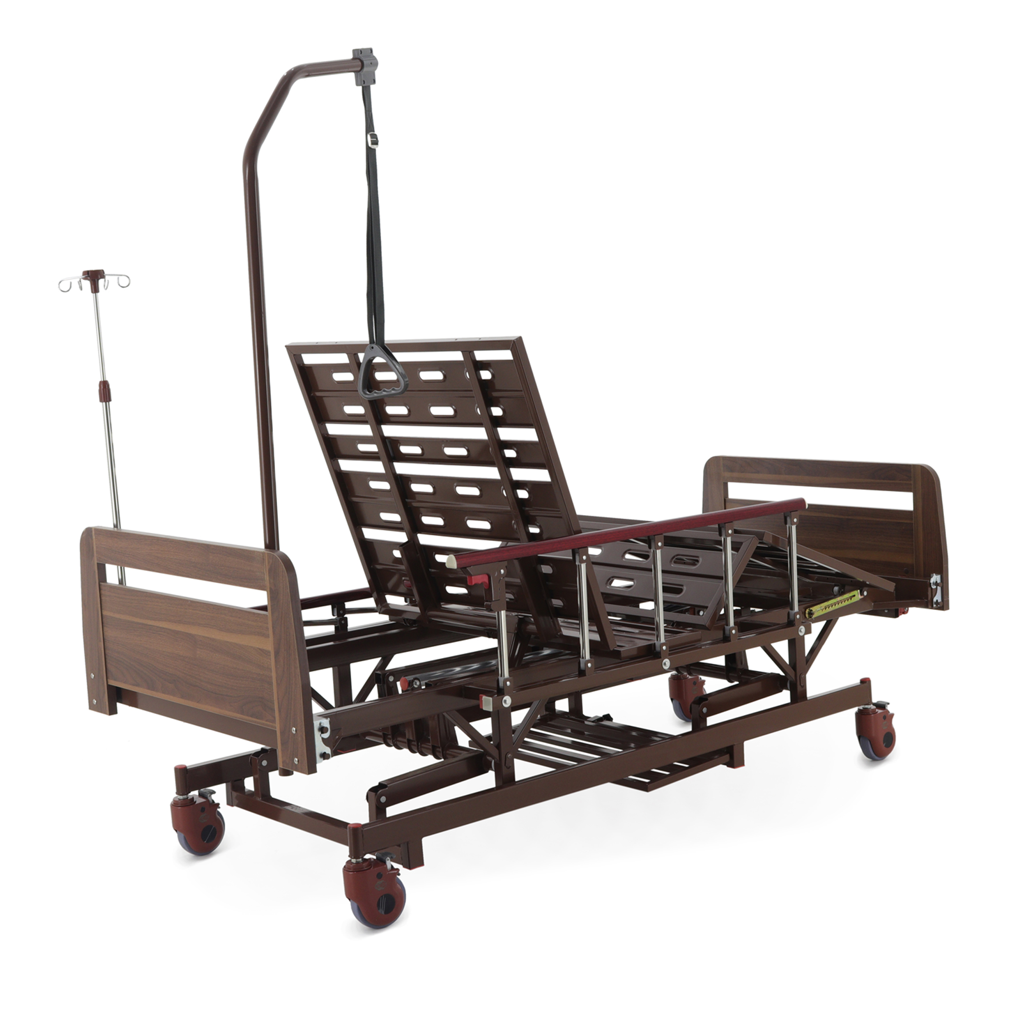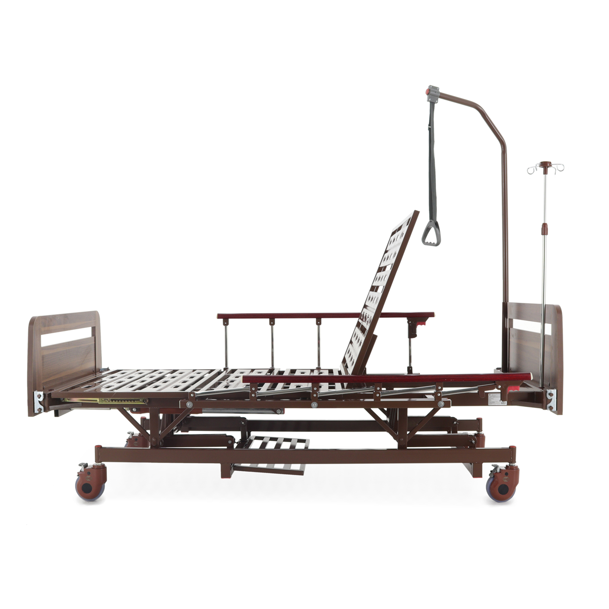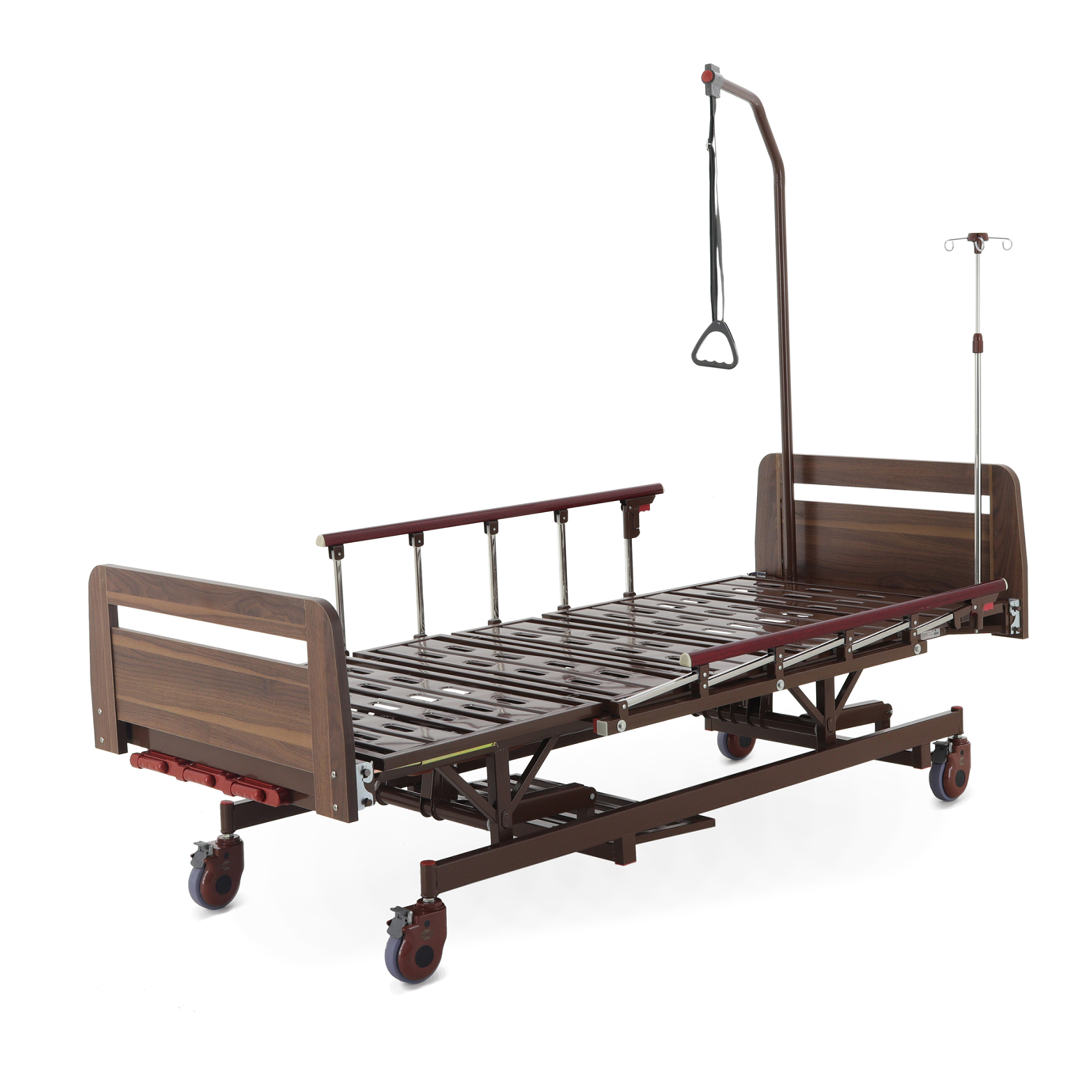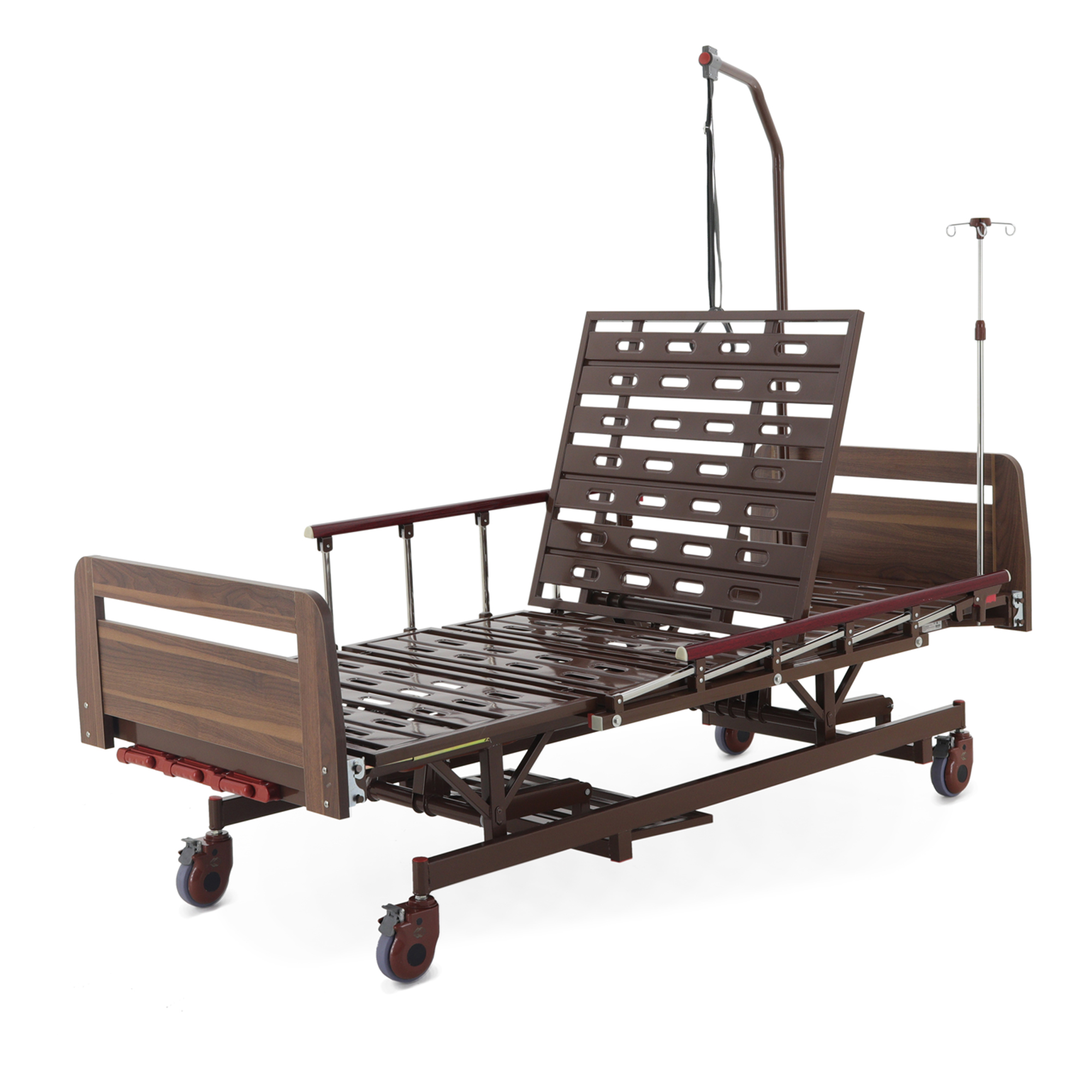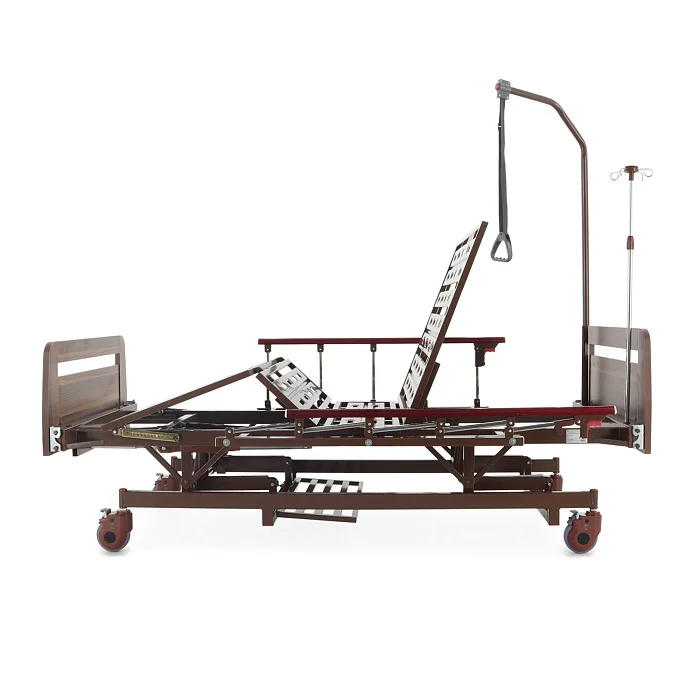 Встроенная «логика» для оснащения — сильная сторона модели: предусмотрены отверстия под инфузионную стойку (4 точки установки), а также крепление в головной части под дугу для подтягивания, которая уже входит в комплект. Это полезно в реабилитации и уходе, когда пациенту важно иметь опору для изменения положения тела.