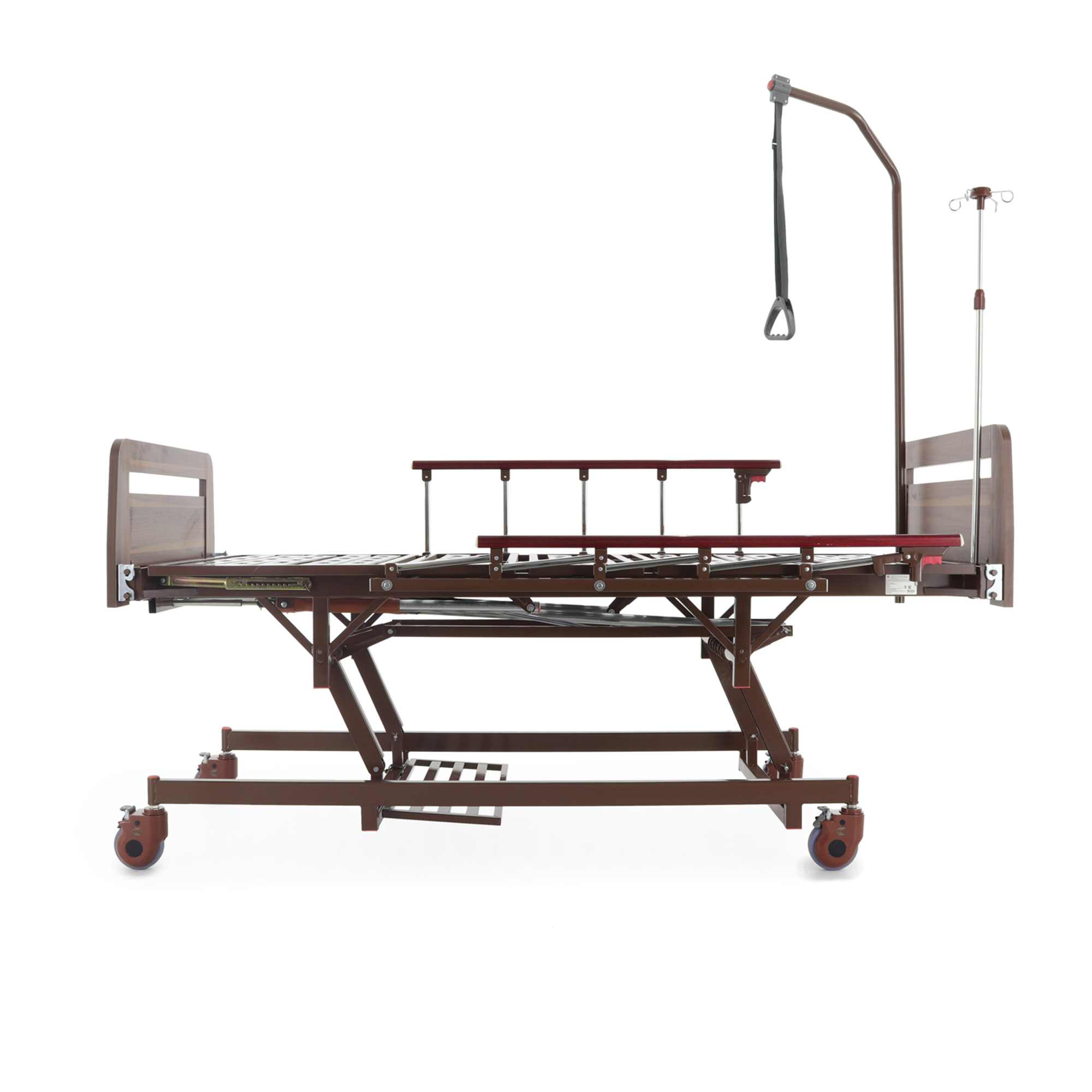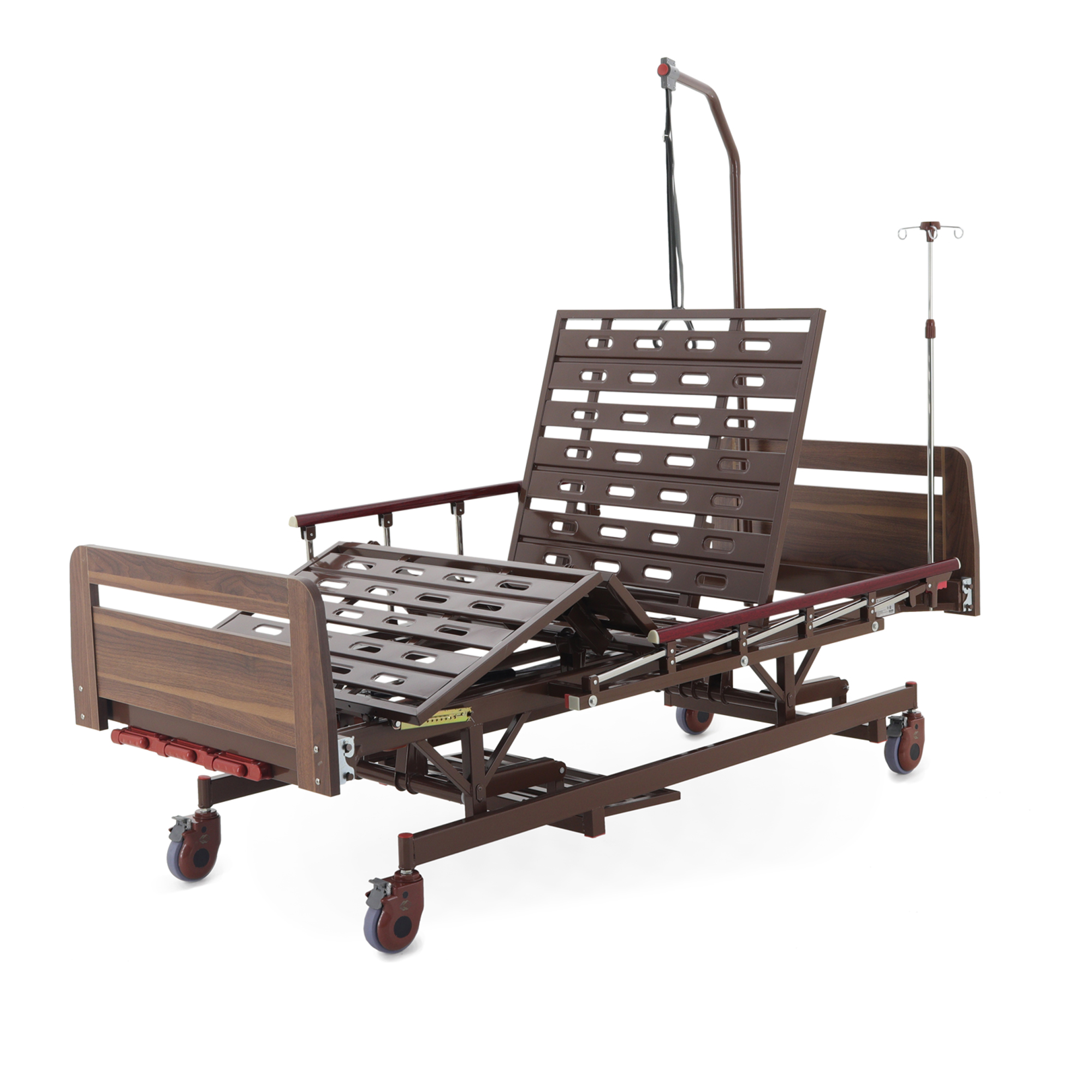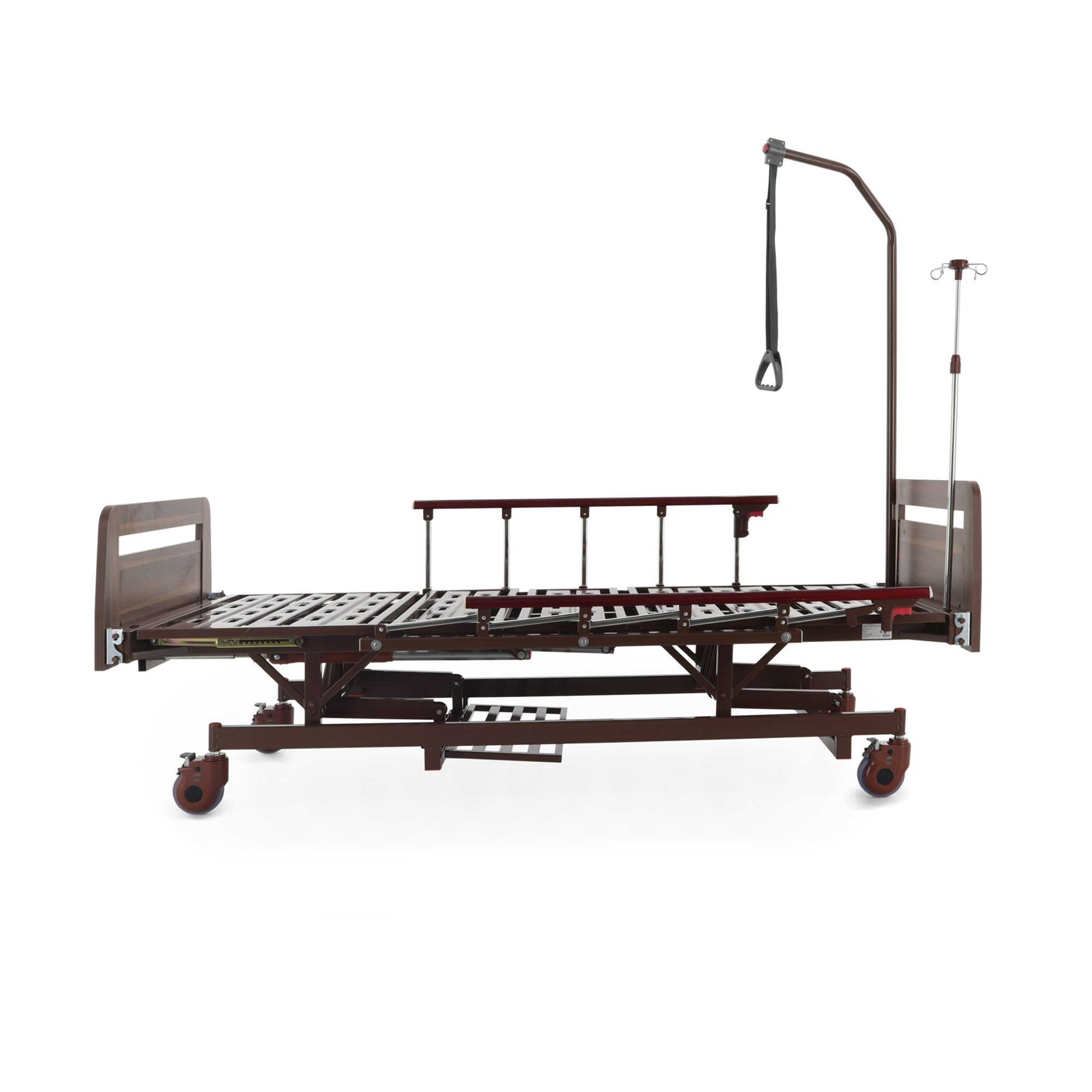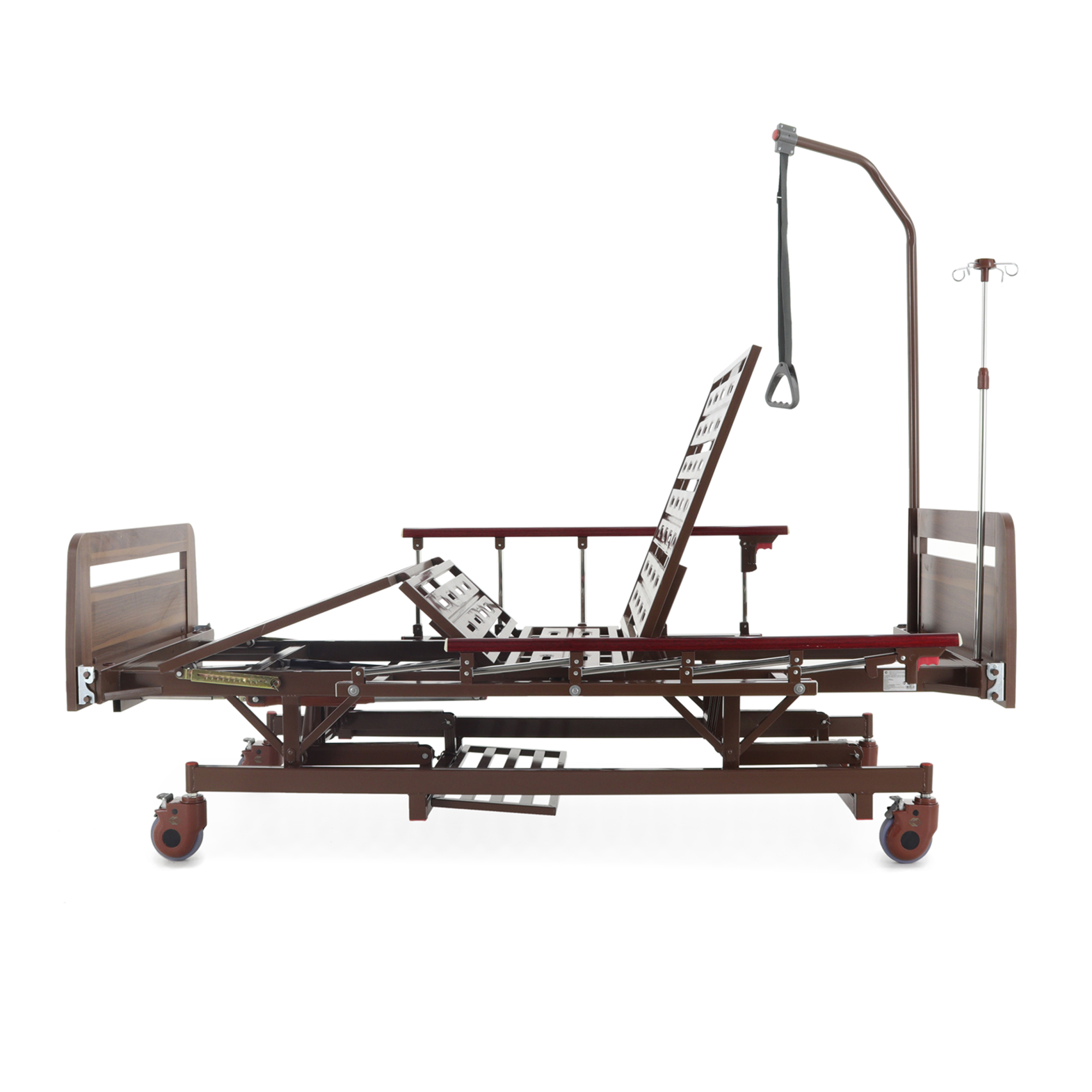 Встроенная «логика» для оснащения — сильная сторона модели: предусмотрены отверстия под инфузионную стойку (4 точки установки), а также крепление в головной части под дугу для подтягивания, которая уже входит в комплект. Это полезно в реабилитации и уходе, когда пациенту важно иметь опору для изменения положения тела.