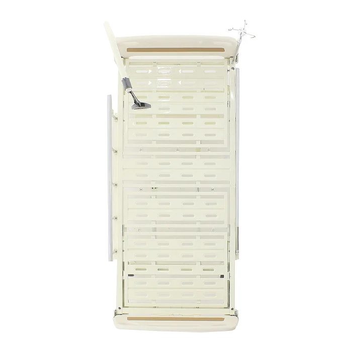 Основу кровати составляет прочная рама из стального профиля с антикоррозийным покрытием — это оптимальный вариант для клиник и частных центров, где оборудование регулярно обрабатывается моющими и дезинфицирующими средствами. Ложе выполнено из ABS-пластика и разделено на 4 секции: материал не боится влаги, не впитывает загрязнения и сохраняет внешний вид при интенсивной эксплуатации.