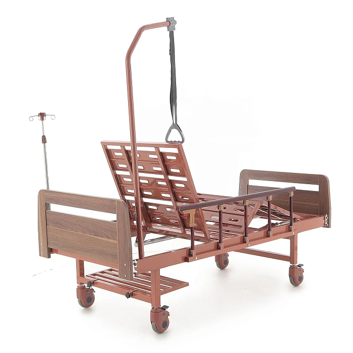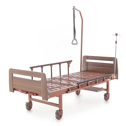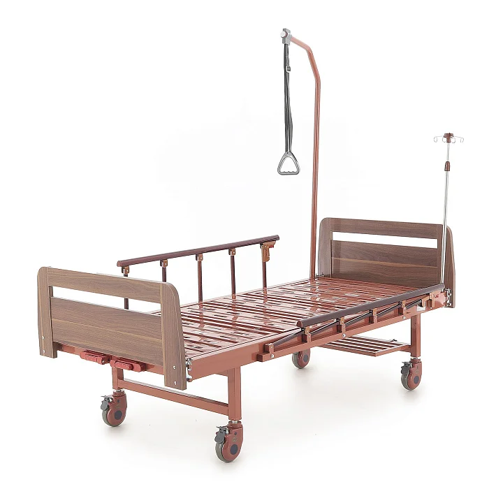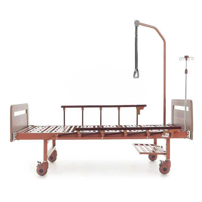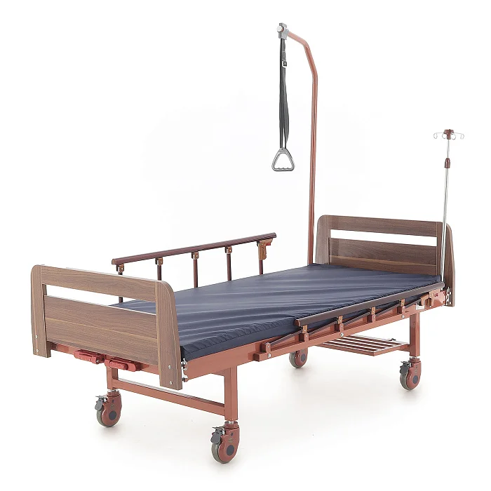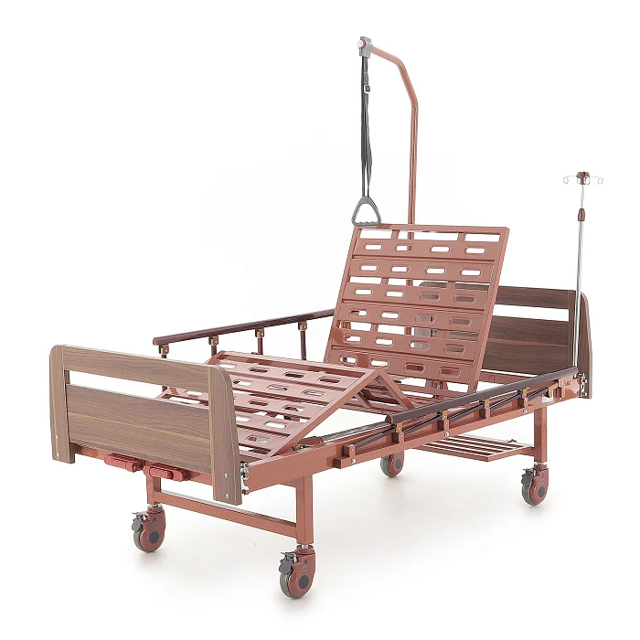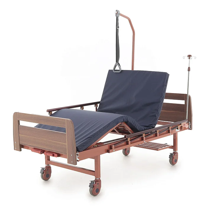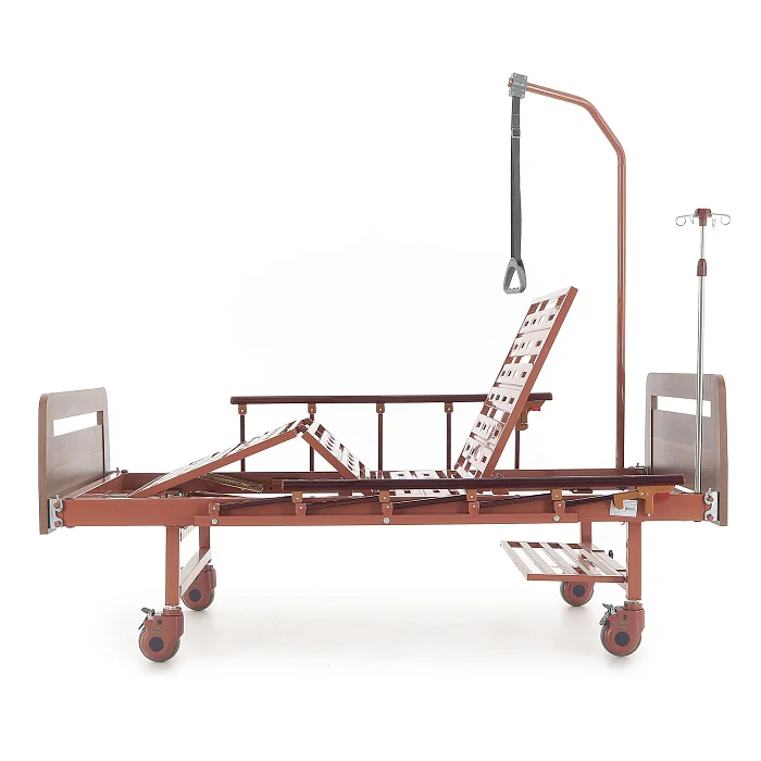 Кровать механическая Med-Mos E-8 (ЛДСП, коричневый) — практичная механическая кровать для ухода дома или в медицинском учреждении. Ложе разделено на 4 секции, из которых 3 регулируются, помогая подобрать удобное положение для отдыха, кормления, процедур и восстановления.
