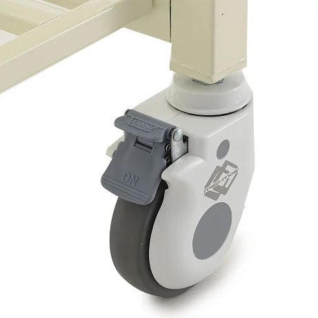 Кровать оснащена 4 самоориентирующимися одинарными колесами из немаркого полиуретана (поворот 360°) диаметром 12,5 см. Для безопасной фиксации предусмотрен индивидуальный тормоз на каждом колесе с одновременной блокировкой поворота — кровать надежно «встает» на место, что важно при пересаживании пациента, выполнении процедур и уборке.
