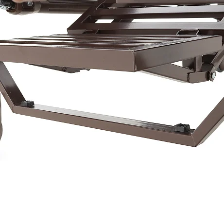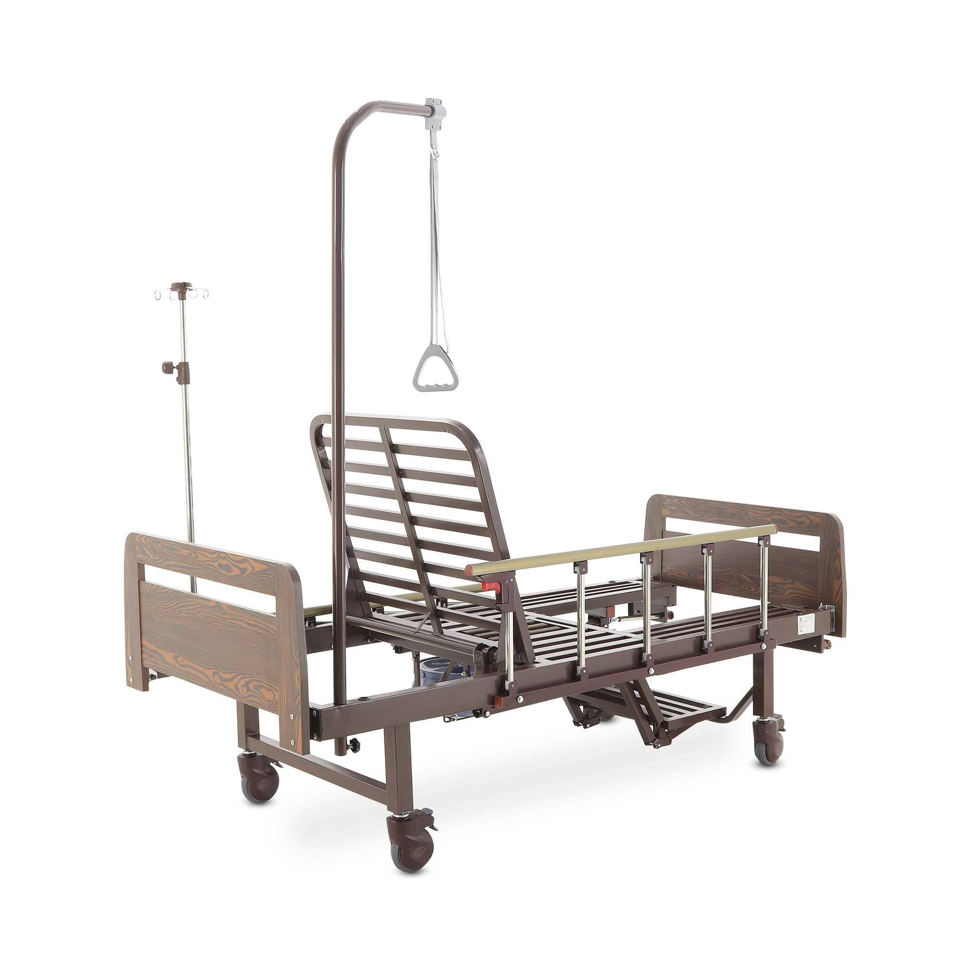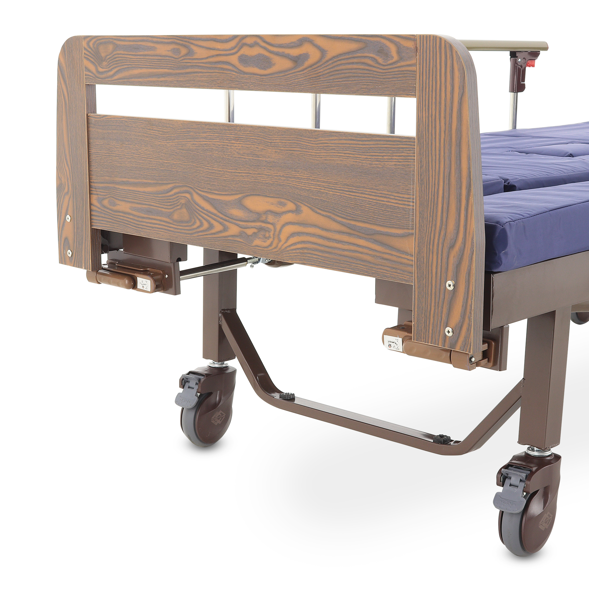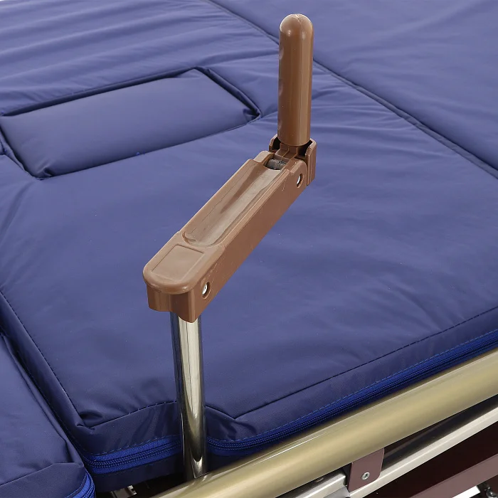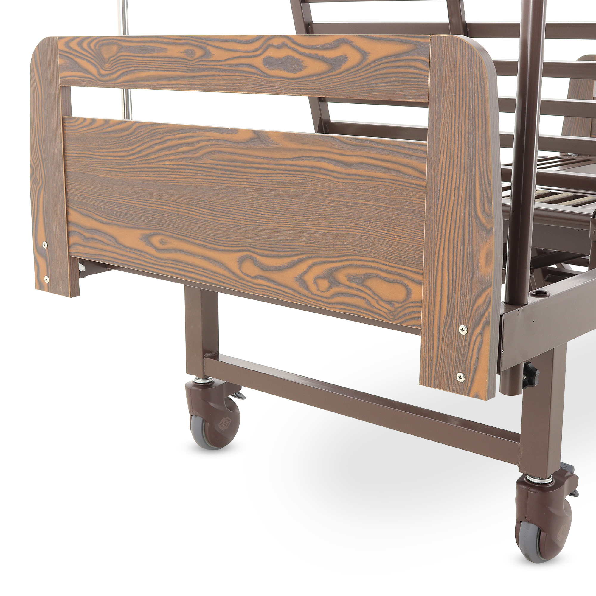 Складные боковые ограждения — компромисс между безопасностью и удобством доступа: их легко поднять, когда нужно снизить риск падения, и так же быстро опустить для проведения манипуляций. Быстросъемные спинки из ЛДСП (венге) визуально «смягчают» медицинскую обстановку — актуально для платных палат, частных клиник и домашнего ухода.