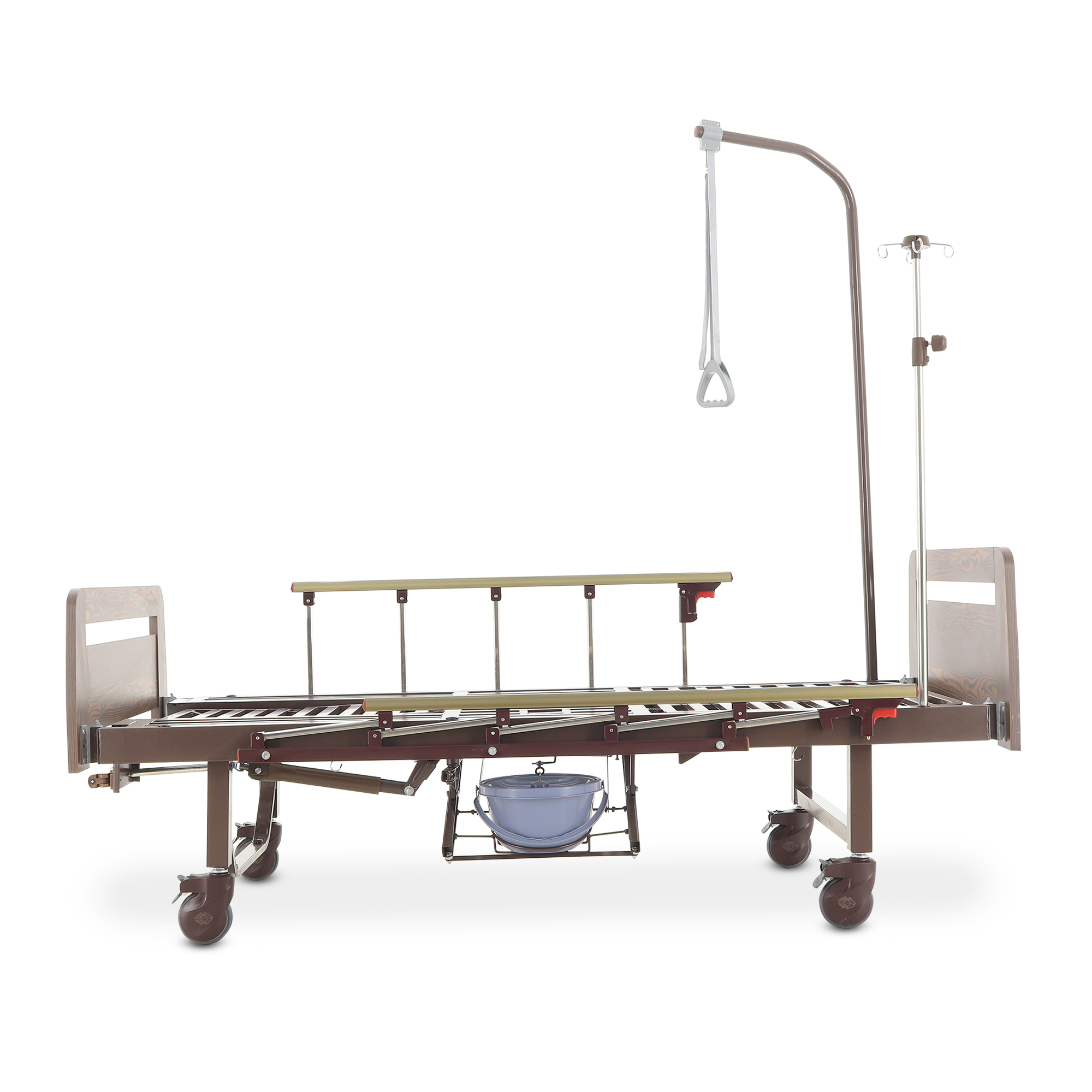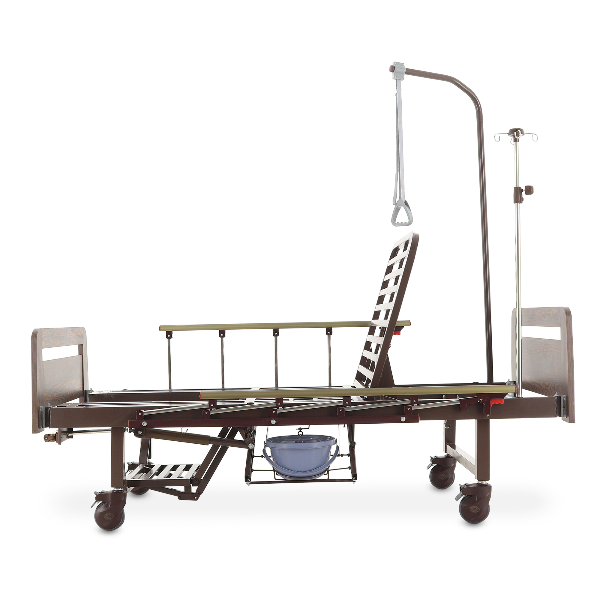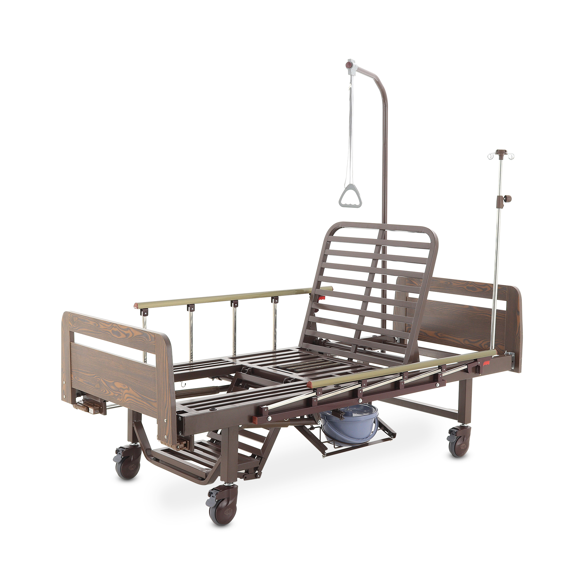 Складные боковые ограждения — компромисс между безопасностью и удобством доступа: их легко поднять, когда нужно снизить риск падения, и так же быстро опустить для проведения манипуляций. Быстросъемные спинки из ЛДСП (венге) визуально «смягчают» медицинскую обстановку — актуально для платных палат, частных клиник и домашнего ухода.