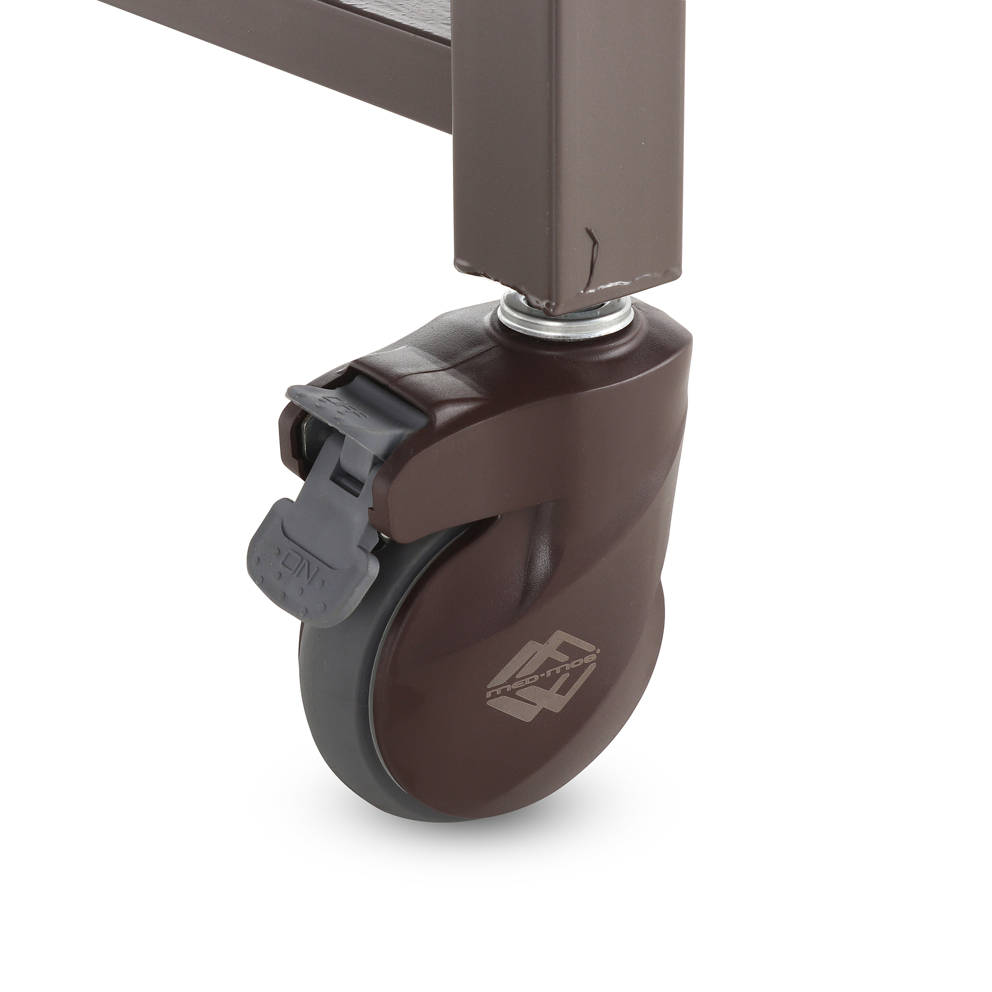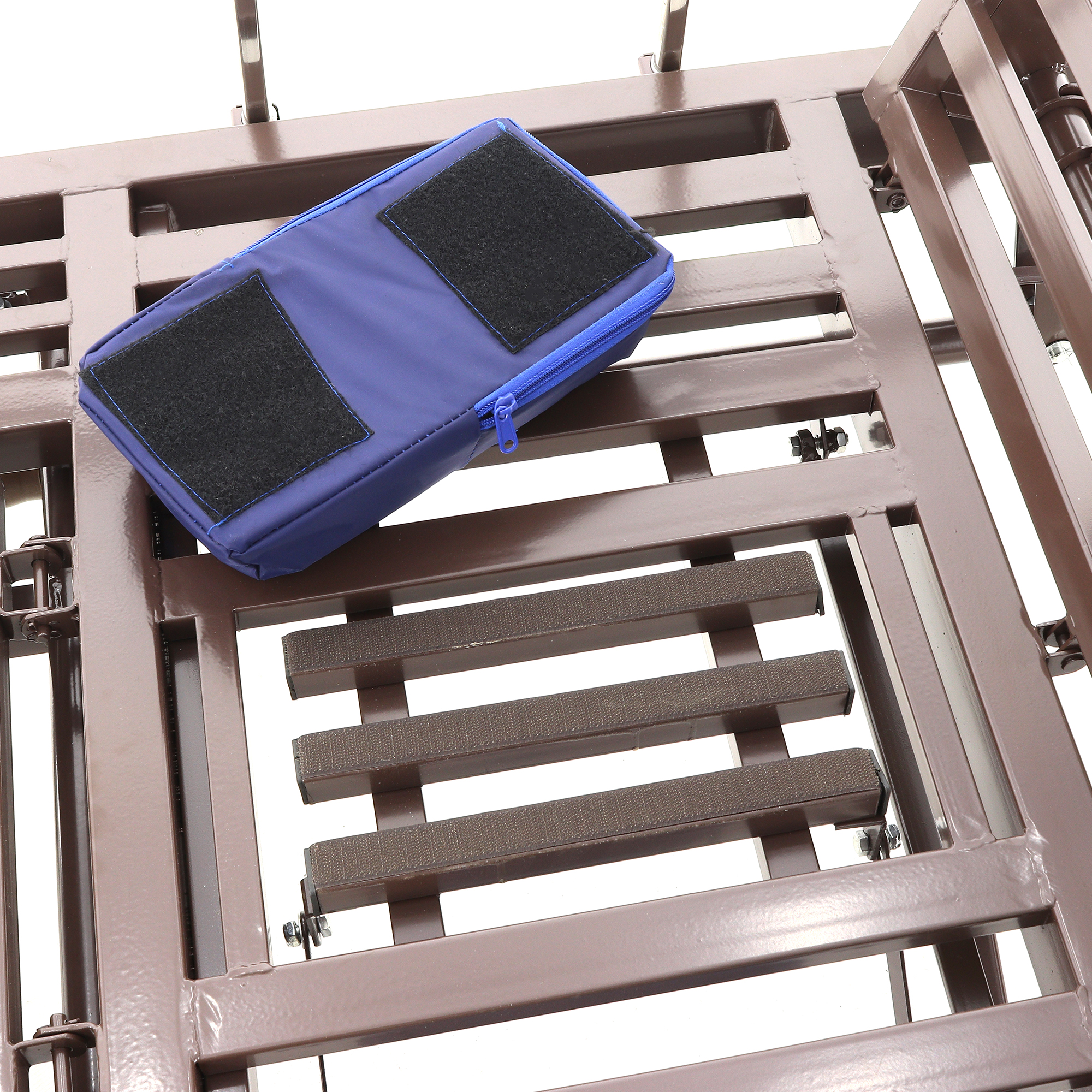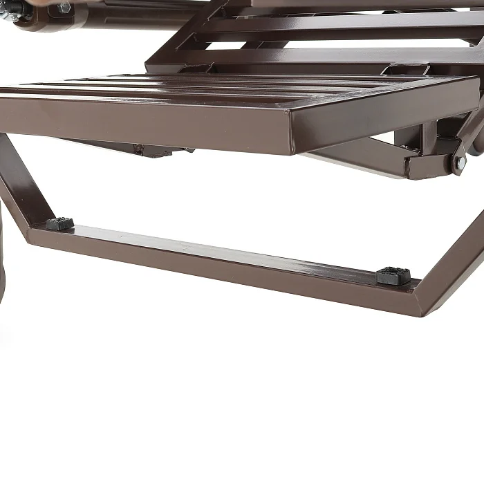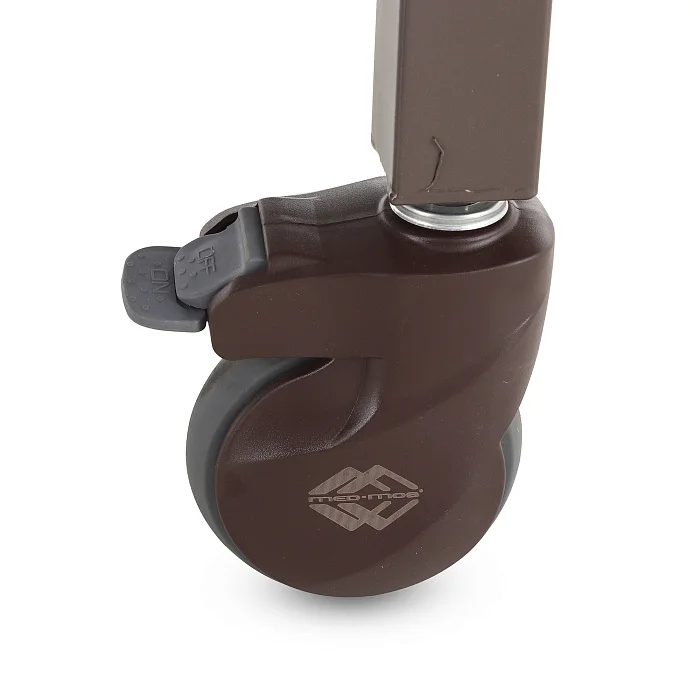 Основа кровати — сталь с эпоксидной эмалью. Такое покрытие хорошо переносит регулярную санитарную обработку и сохраняет аккуратный внешний вид. Колеса с полиуретановым ободом обеспечивают спокойный ход по покрытию, а индивидуальные тормоза фиксируют кровать на месте, что важно при пересаживании, уходе и выполнении процедур.