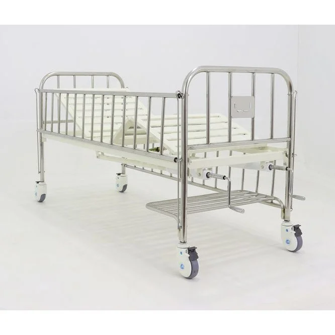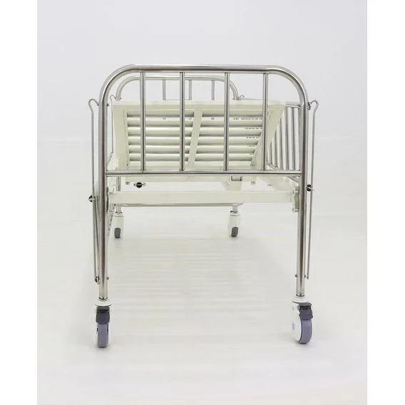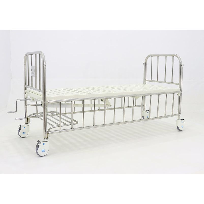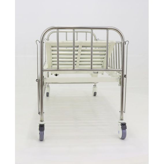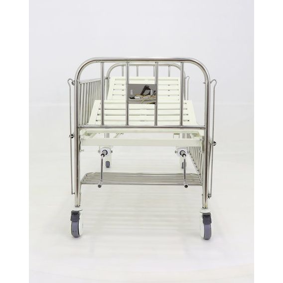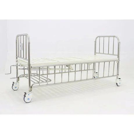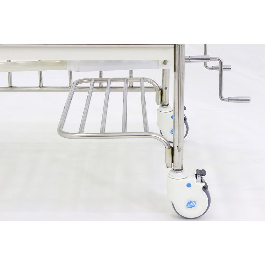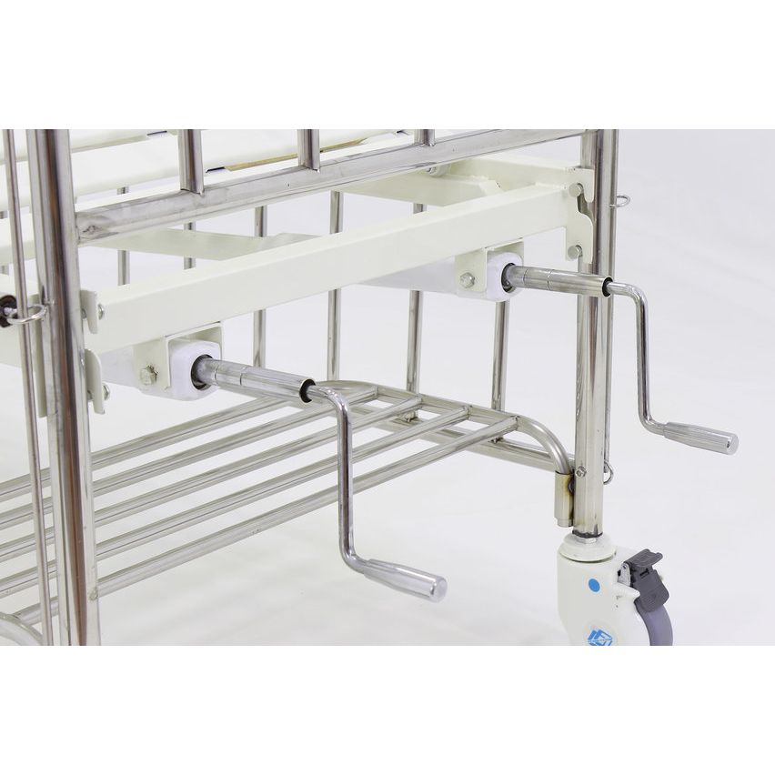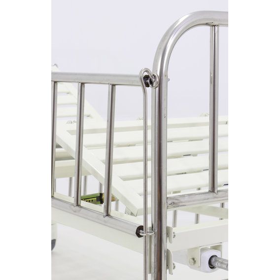 Кровать оснащена двумя боковыми ограждениями из нержавеющей стали. Они опускаются и фиксируются в двух положениях, позволяя подобрать оптимальный режим — для сна, транспортировки по коридору или для проведения процедур и ухода. Вертикальные опорные стойки (12 шт.) повышают общую жесткость ограждений и ощущение защищенности, что особенно важно в подростковых палатах, где пациенты активно двигаются и часто меняют положение во сне.