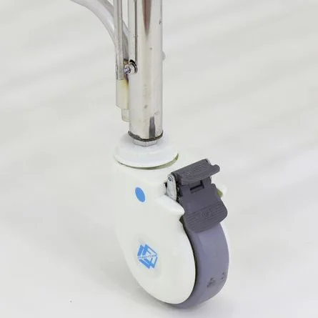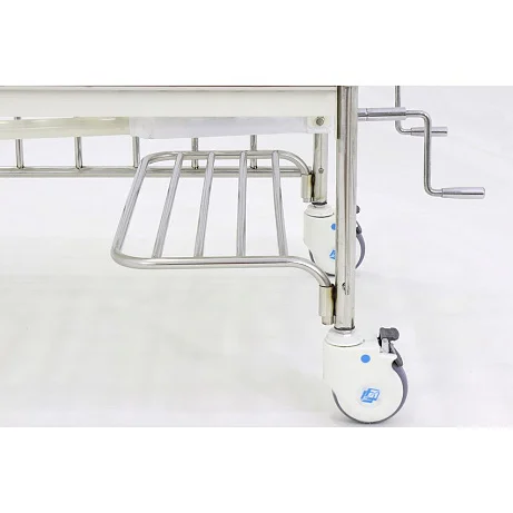 Кровать установлена на четырех самоориентирующихся колесах из немаркого полиуретана с поворотом на 360°. Это облегчает развороты в палатах и коридорах, а также перемещение к процедурному кабинету или в зону уборки. На каждом колесе предусмотрен индивидуальный тормоз с одновременной блокировкой поворота — персоналу удобно фиксировать кровать именно там, где нужно, не «ловя» ее на гладком полу.