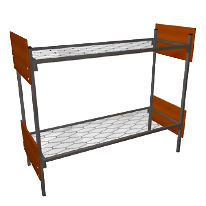 Кровать металлическая двухъярусная со спинками из ЛДСП сетка прокатная пружина 2ДКП-2. Металлические двухъярусные кровати «2ДКП-2», это недорогие стальные кровати с деревянными спинками. Модель привлекательно смотрится в каждом интерьере. Советуем купить металлические 2 ярусные кровати для хостелов, общежитий, в пансионаты, детские лагеря, на турбазу. Выгодно приобретение кроватей для размещения рабочих и строителей. За дополнительные деньги можно приобрести лестницы, заказать ограничители, и нарастить металлические ламели.