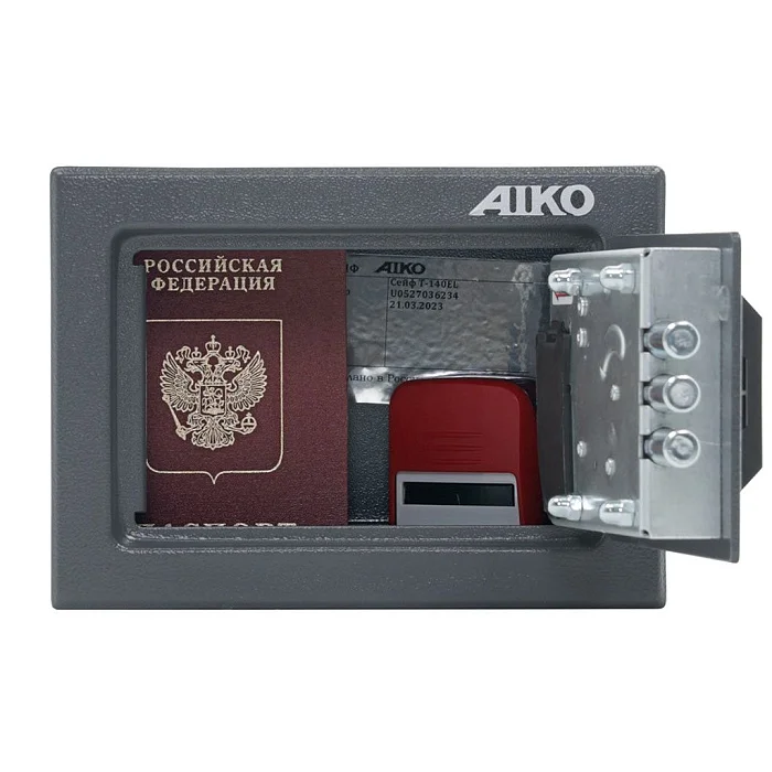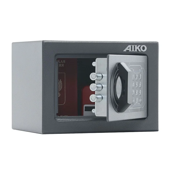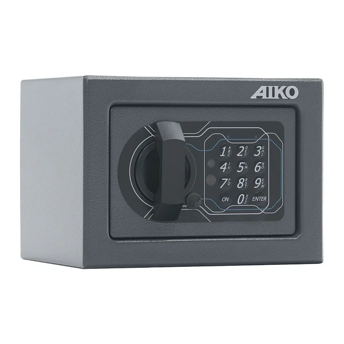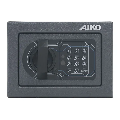 Компактный и простой по конструкции мебельный и офисный сейф AIKO T-140 EL предназначен для хранения незначительных ценностей. Также в нем допускается хранение документов и личного оружия. Запирается дверь сейфа на кодовый электронный замок. Дополнительно в комплектацию входит аварийный мастер-ключ. Закрепить конструкцию можно на стене или на полу. Для этого используются анкерные болты. Поверхность металлического сейфа покрыта порошковой краской цвета графит. Такое оформление делает эту модель сейфа очень привлекательной.