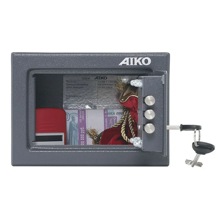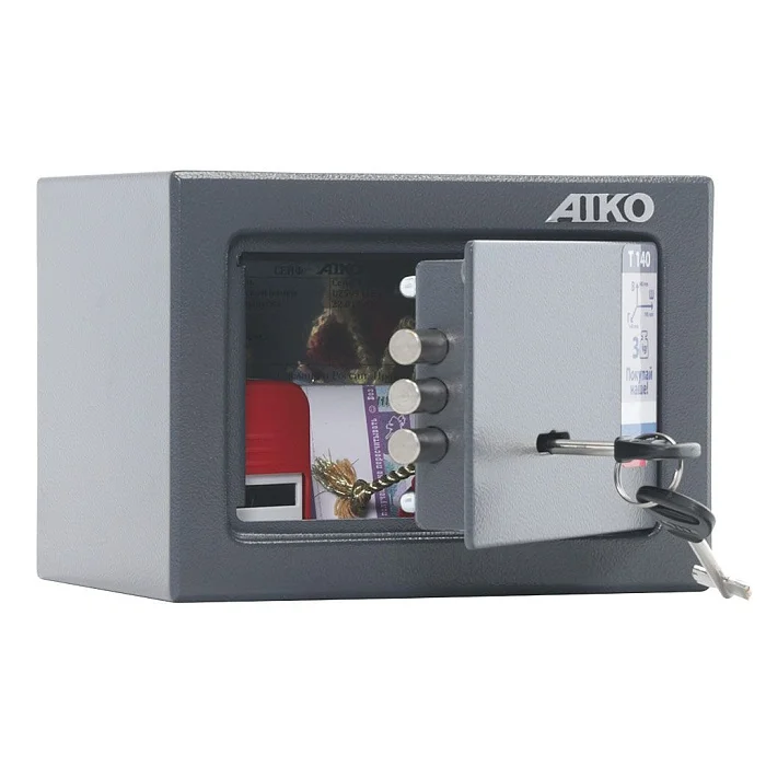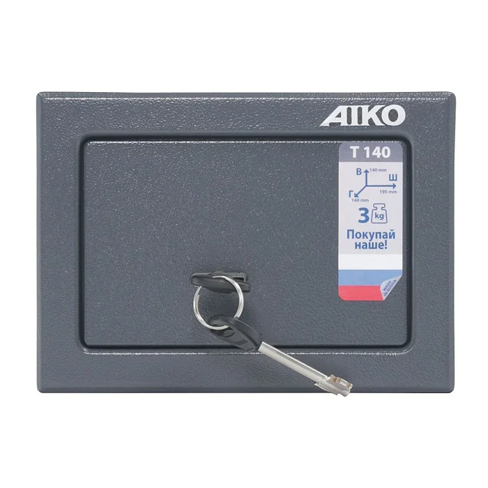 Привлекательный мебельный и офисный сейф AIKO T-140 KL покрыт порошковой краской, которая создает полимерное покрытие цвета графит на поверхности металлической конструкции. Запирается сейф на надежный ключевой замок Border. Его можно закрепить на полу или стене анкерными болтами. Предназначен компактный сейф для хранения незначительных ценностей и документов.