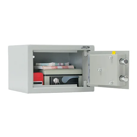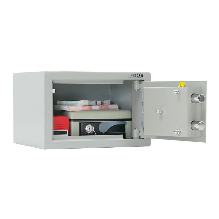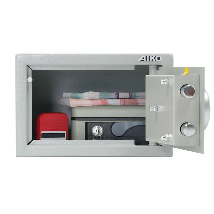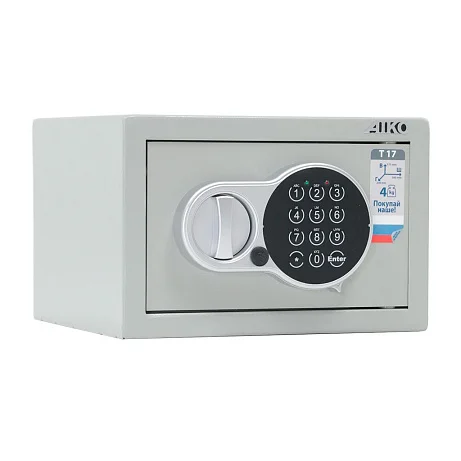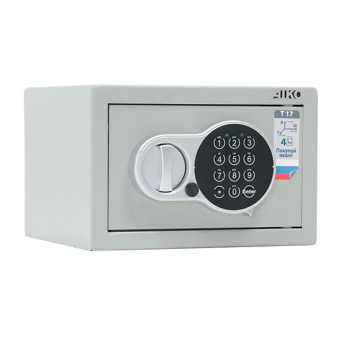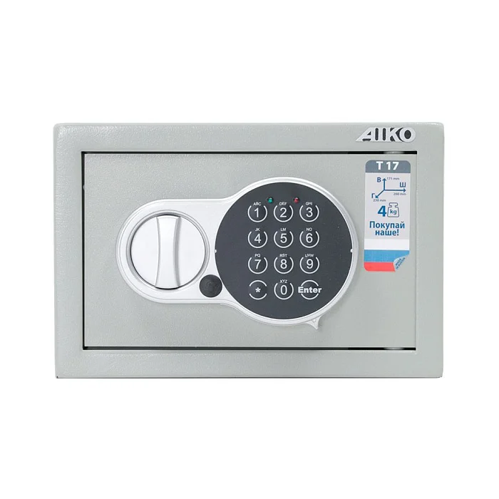 Компактный мебельный и офисный сейф AIKO T-17 EL оснащен электронным кодовым замком. Дополнительно в комплектации сейфа предусмотрен аварийный мастер-ключ. Небольшую конструкцию можно закрепить к полу или стене. Для этого применяется анкерное крепление. Металлическая поверхность сейфа окрашена порошковой краской, которая создает долговечное полимерное покрытие.