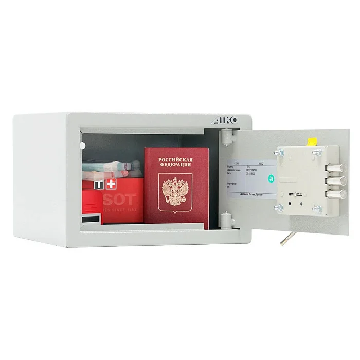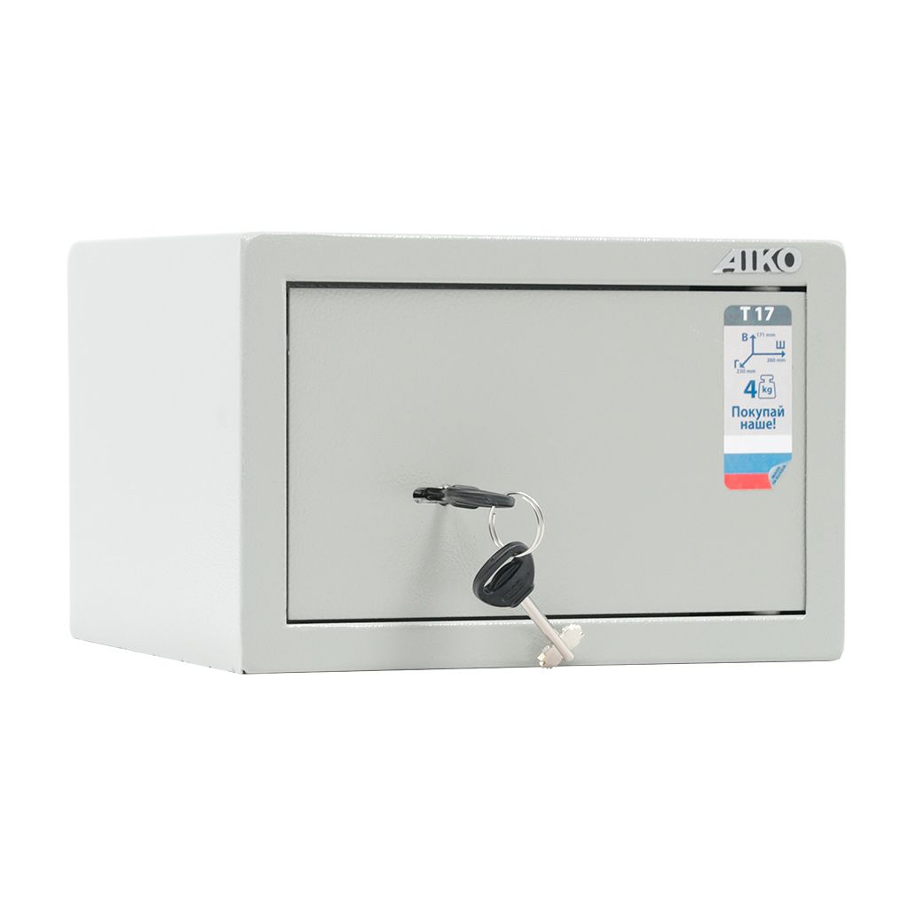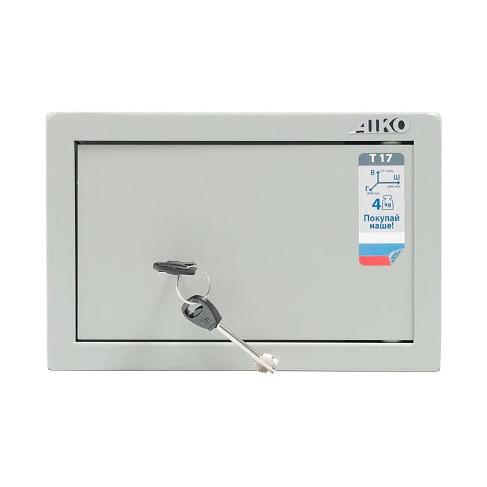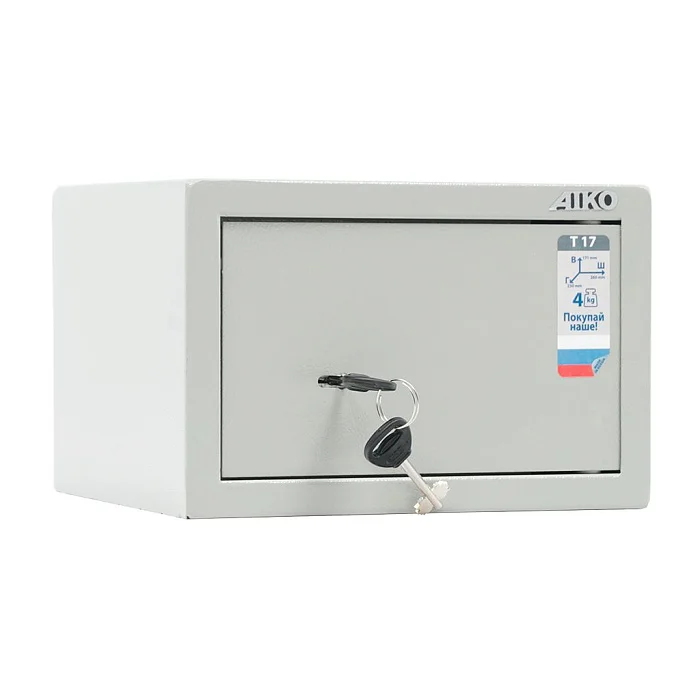 Простой, компактный и надежный мебельный и офисный сейф AIKO T-17 запирается на ключевой замок. Корпус сейфа может быть зафиксирован к стене или полу анкерным креплением. Сейф не очень большой, поэтому хранить в нем можно самые важные и ценные вещи. Корпус изготовлен из прочного металла, толщина боковых стенок составляет 1,2 мм, а передней панели — 2,8 мм. Поверхность металла покрыта порошковой краской.