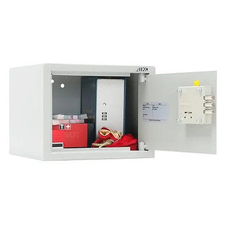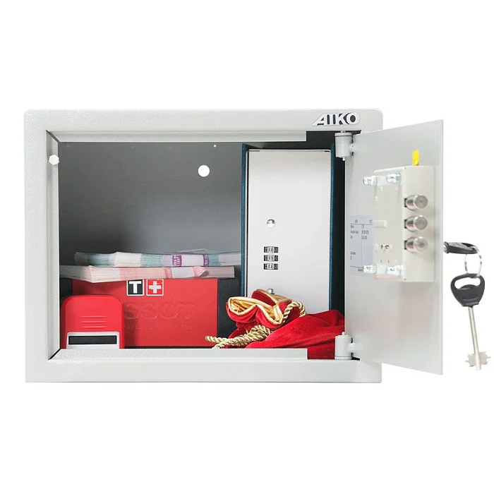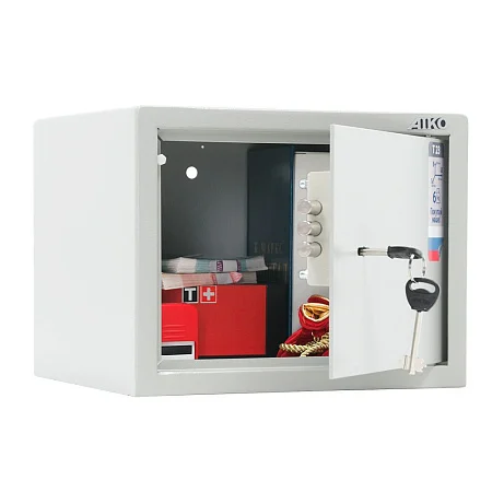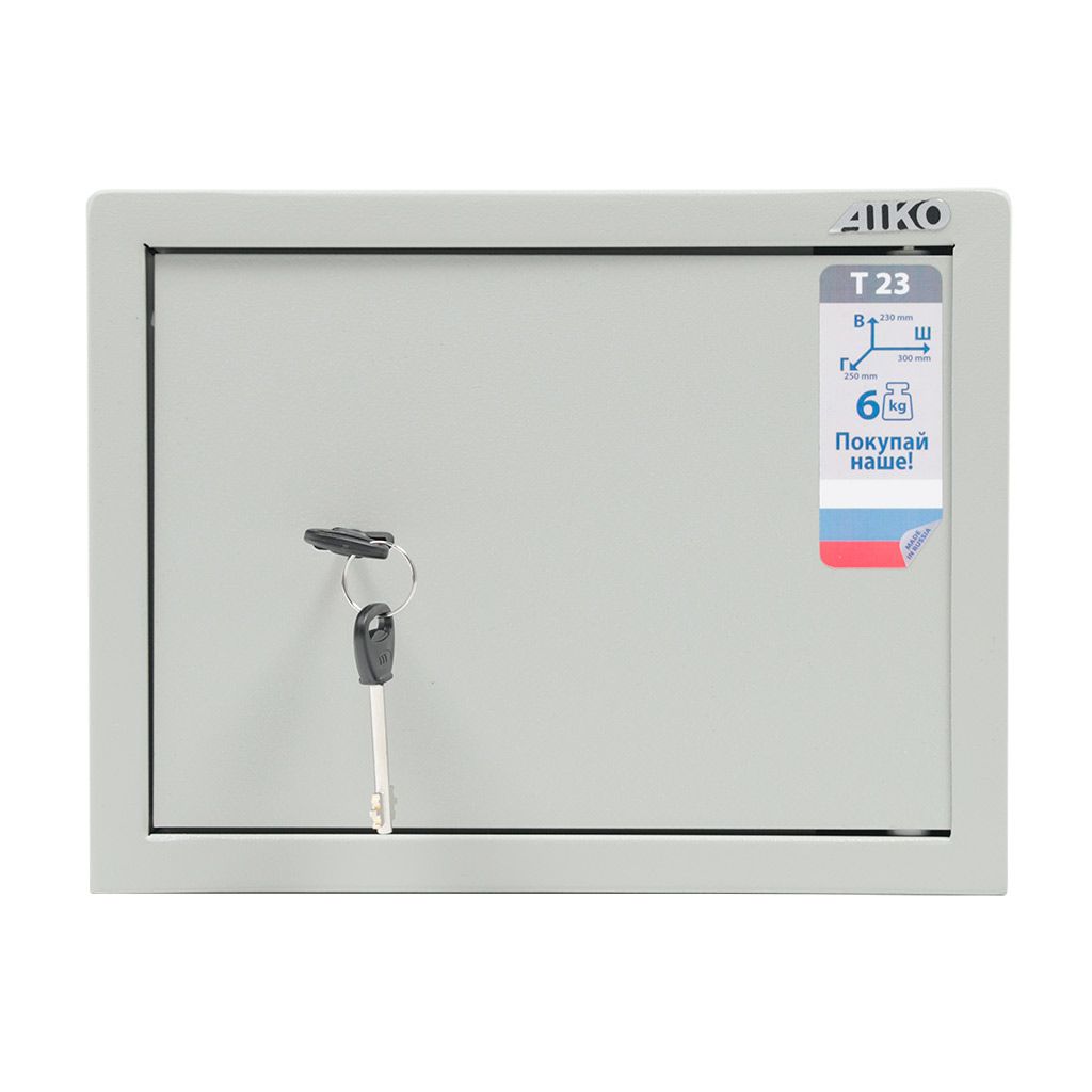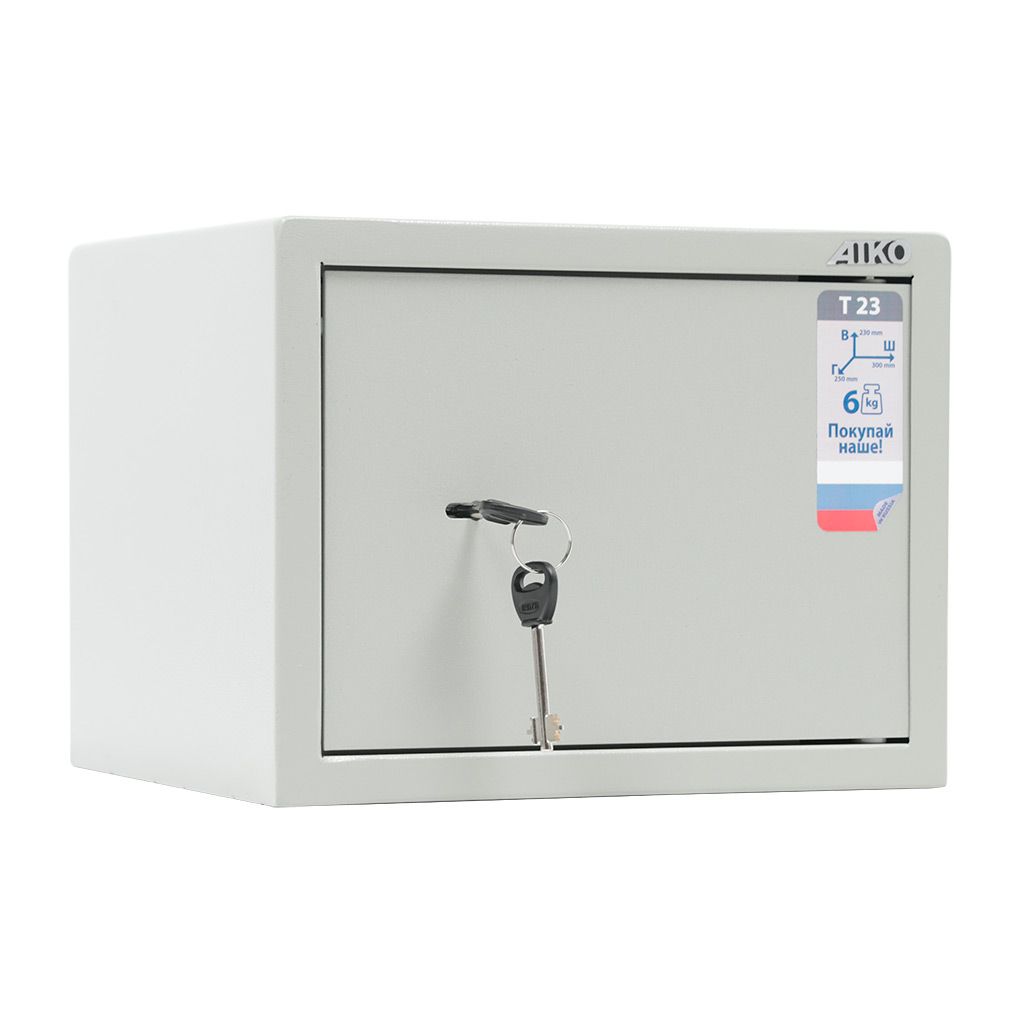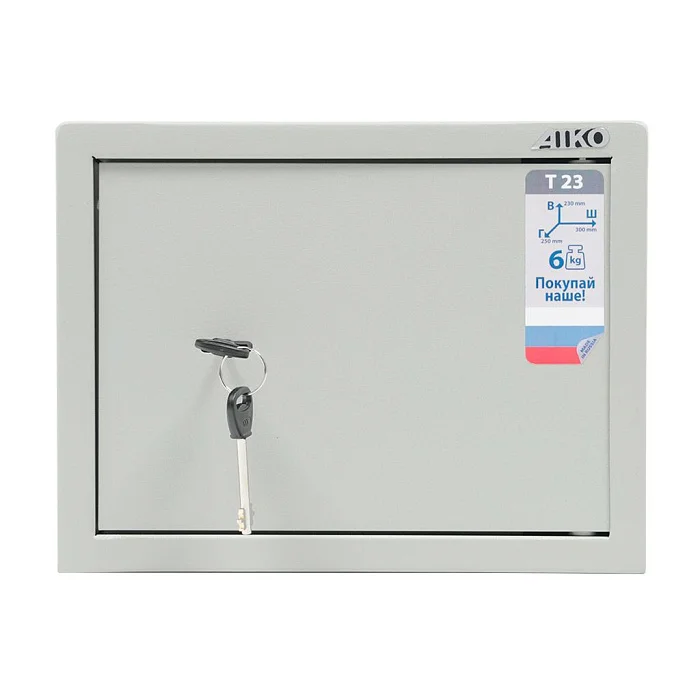 Мебельный и офисный сейф AIKO T-23 закрывается на ключевой замок. Хранить ценные вещи в нем будет безопасно и удобно. Простая конструкция может быть закреплена на полу или зафиксирована на стене при помощи анкерного крепления. Сейф небольшой и компактный. Его поверхность покрывается порошковой краской, которая образует полимерное покрытие. Толщина передней панели сейфа составляет 2,8 мм, а боковых стенок — 1,2 мм.