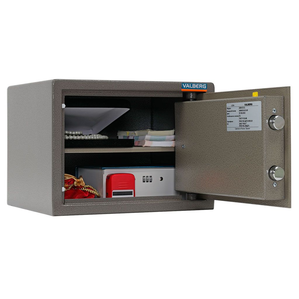 Мебельный и офисный сейф Valberg ASM 25 CL комплектуется двумя замками для надежного хранения ценностей. На дверь установлен механический замок, который открывается кодовой комбинацией (без возможности ее смены), и ключевой замок KABA MAUER. Металл, используемый для изготовления лицевой панели, в толщину 5 мм. Боковые стенки изготавливаются из металла толщиной 2 мм. В конструкции предусмотрена защита от высверливания замка. Сейф можно прикрепить к стене или полу анкерами.