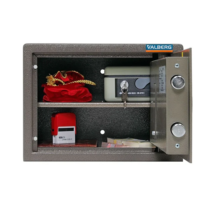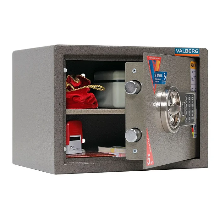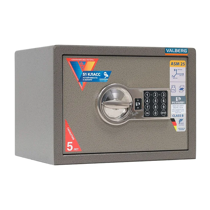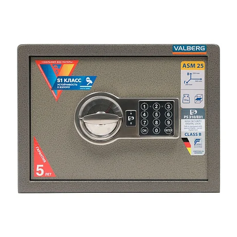Сохранность любых ценностей обеспечит мебельный и офисный сейф Valberg ASM 25 EL. В конструкции предусмотрена защита от высверливания замка. Комплектуется эта модель электронным замком ПРОМЕТ, который открывается при введении кодовой комбинации. Конструкцию можно закрепить анкерами на полу или к стене. У этой модели устойчивость ко взлому класса S1. Толщина боковых стенок конструкции составляет 2 мм, лицевой панели — 5 мм.