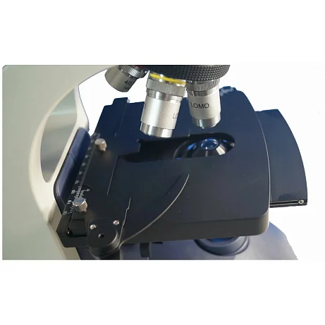 В состав поставки входят ахроматические объективы и широкопольные окуляры, что обеспечивает четкость изображения по полю и предсказуемую цветопередачу. Бинокулярная насадка вращается на 360° в закрепленном положении, имеет наклон 30° и позволяет настроить межзрачковое расстояние в диапазоне 55–75 мм, сохраняя параллельность оптических осей. Револьвер повернут от наблюдателя; предусмотрены четыре позиции под объективы 4×, 10×, 40× и 100× (иммерсионный), с возможностью вращения в любом направлении без потери фиксации положений.