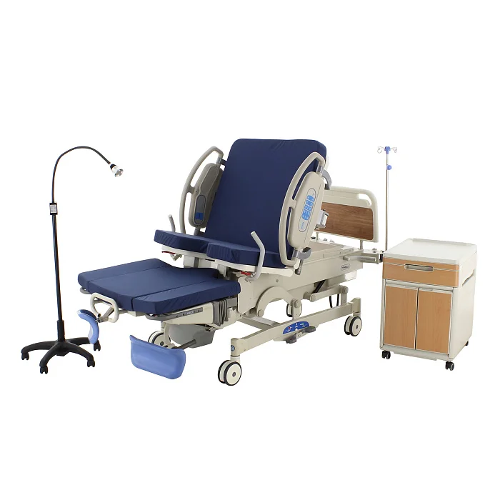 Одно из важных преимуществ модели — богатый комплект поставки. Вместе с кроватью поставляются матрас с V-образным вырезом и влагостойкими съемными чехлами, инфузионная стойка, передвижная трансфузионная стойка, процедурный светильник, процедурный стул, передвижной лоток для инструментов, прикроватная тумбочка, опора для роженицы, контейнер для стока жидкости и емкость для сбора биоматериала. Для медицинского учреждения это означает сокращение времени на оснащение рабочего места и более предсказуемый бюджет закупки.
