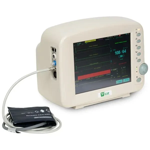Монитор G3F измеряет и отображает: ЭКГ, неинвазивное артериальное давление (НИАД), сатурацию SpO₂, пульс, температуру тела, дыхание RESP, частоту дыхания (ЧД) и частоту сердечных сокращений (ЧСС). Врач получает не только цифры, но и цветные графики, которые ускоряют оценку состояния — от ритма до дыхательных изменений.