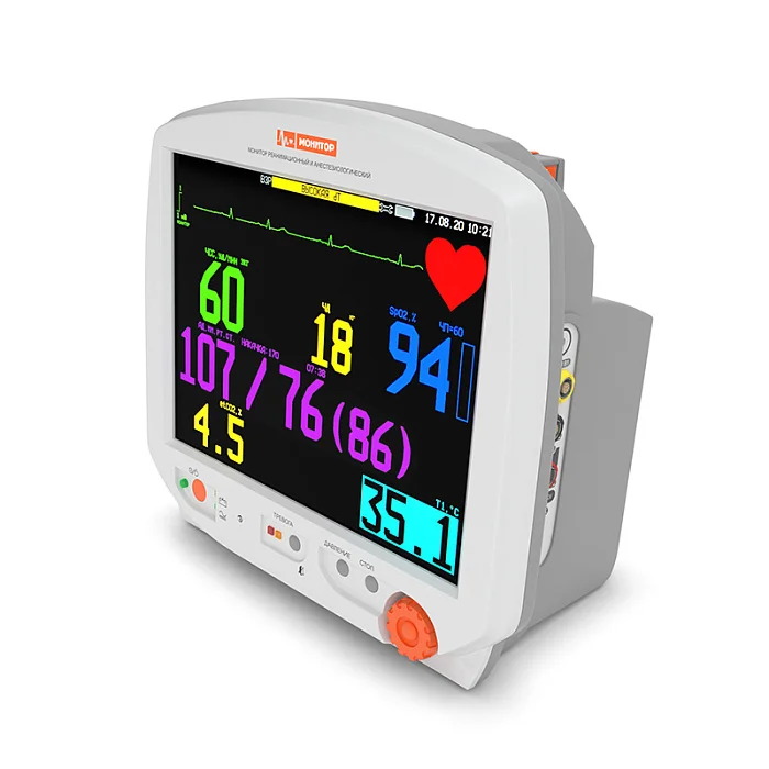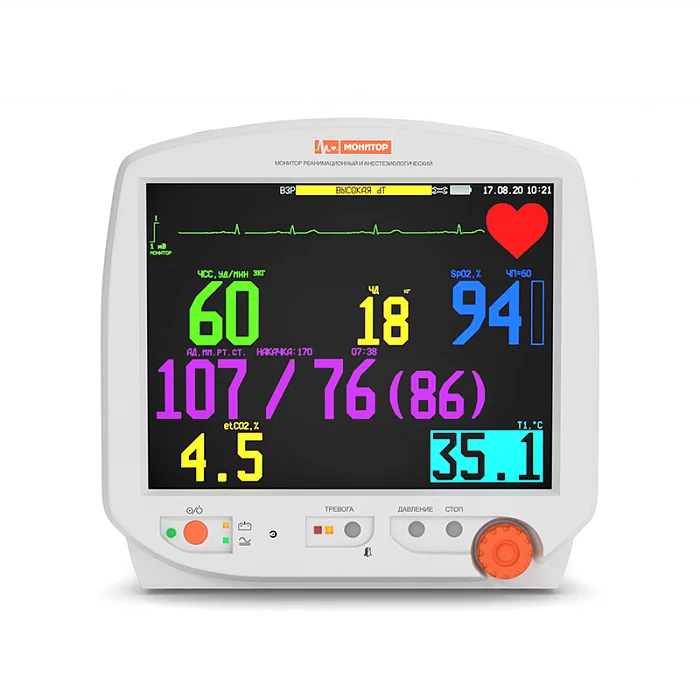 Монитор реанимационный и анестезиологический МИТАР-01-«Р-Д» используется для исследования 5 физиологических параметров пациента: ЭКГ, SPO2, АД, ПГ, температура (Т).