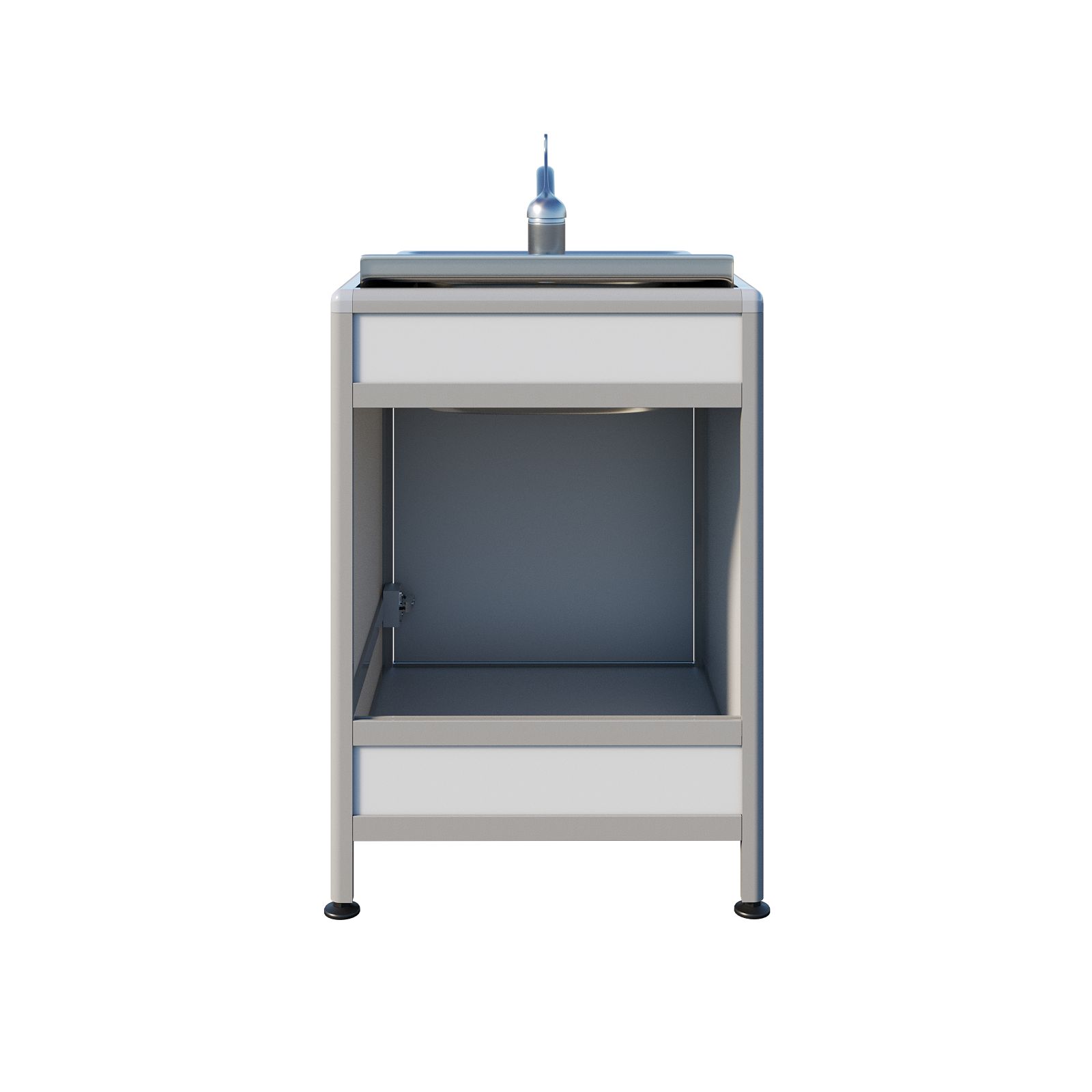 Медицинская мойка ММ 13.001al предназначена для оснащения лабораторий и других медицинских учреждений. Конструкция выполнена на каркасе из алюминиевого профиля и облицована ЛДСП толщиной 8 мм. Врезная одночашевая мойка со смесителем устанавливается на тумбу. Тумба оснащена распашной дверцей, а высота ножек регулируется с помощью винтовых опор.