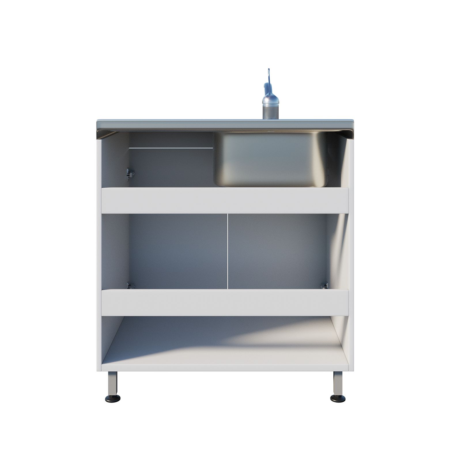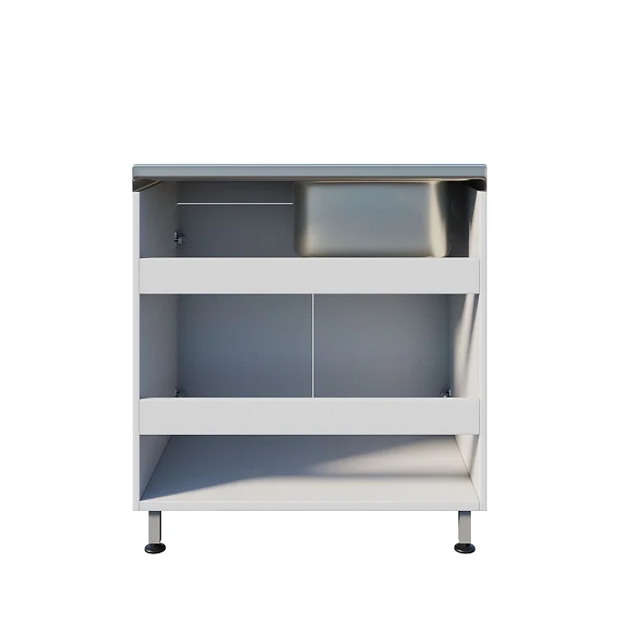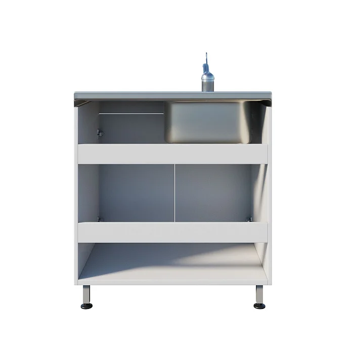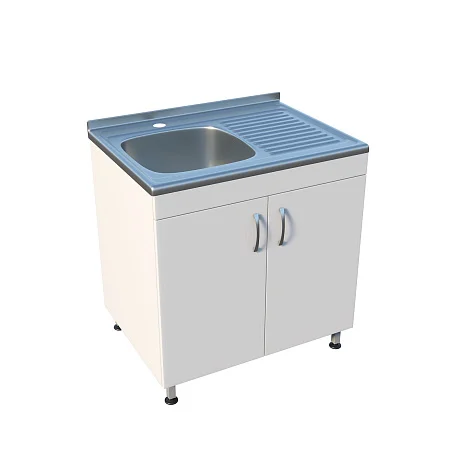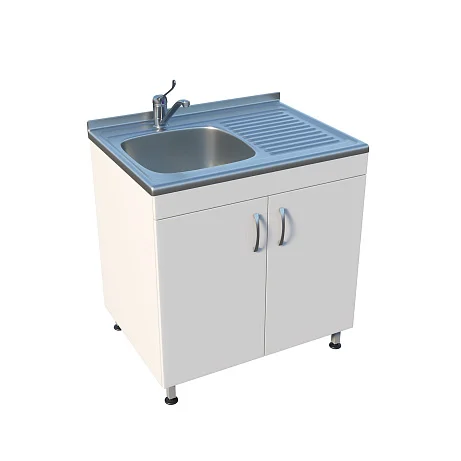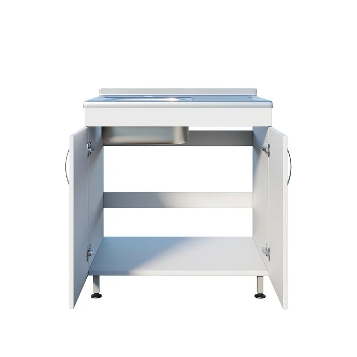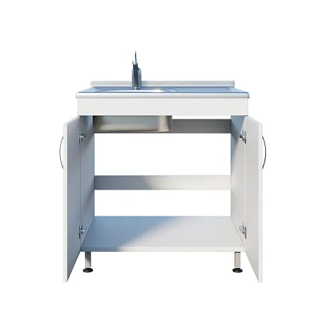 Медицинская мойка ММ 13.003 подходит для установки в лечебных учреждениях и любых лабораториях. Мойка накладная выполнена из нержавеющей стали и устойчива к воздействию большинства химических веществ. Рабочая поверхность справа. Смеситель хирургический локтевой. Под чашей расположена вместительная тумба с двумя распашными дверцами, предназначенная для хранения различных принадлежностей. Ножки оснащены винтовыми регулируемыми опорами, которые позволяют выставить нужную высоту и компенсировать неровности пола. Тумба изготовлена из ЛДСП толщиной 16 мм.