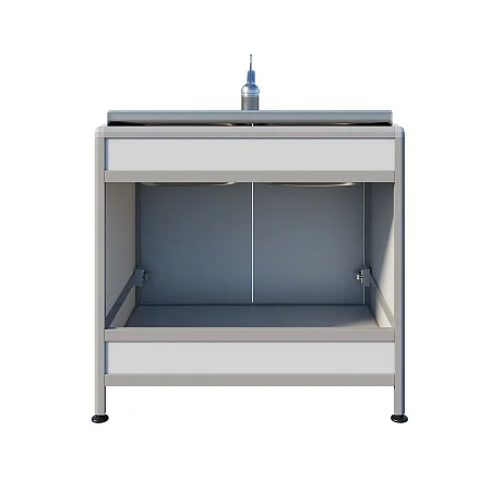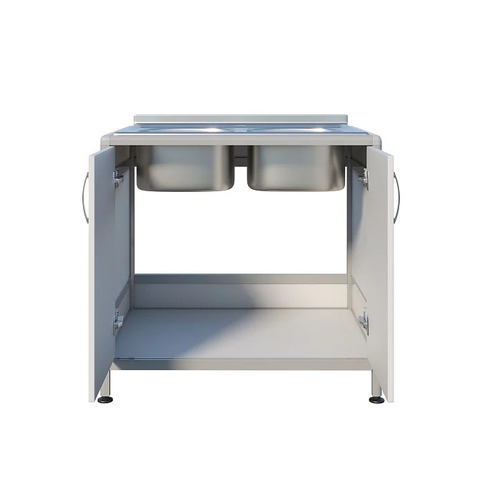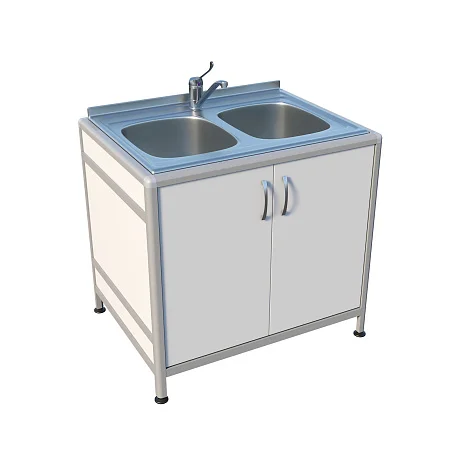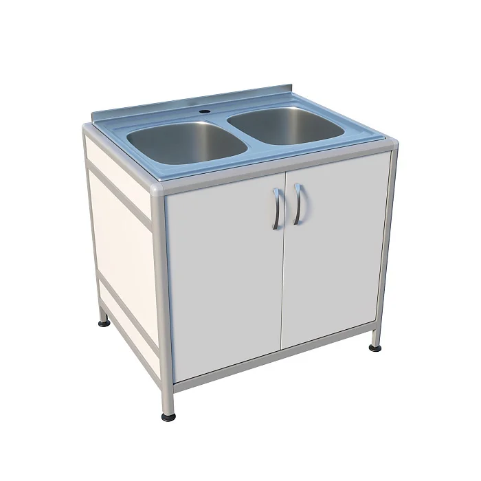Медицинская мойка ММ 13.003al предназначена для установки в лабораториях и других медицинских учреждениях. Стол комплектуется двухчашечной мойкой, врезаемой в столешницу. Каркас выполнен из алюминиевого профиля, тумба облицована ЛДСП толщиной 8 мм. Тумба под мойкой оснащена дверцами, а на ножках предусмотрены регулируемые опоры.