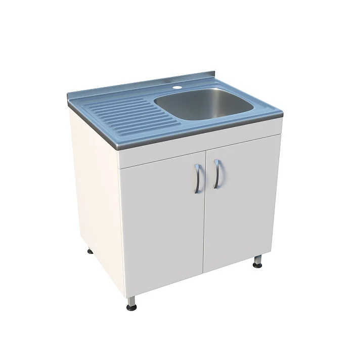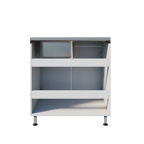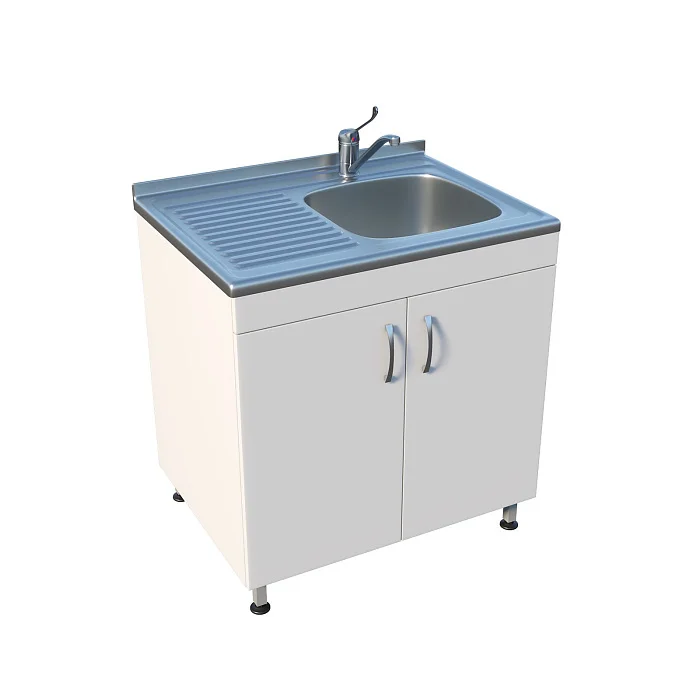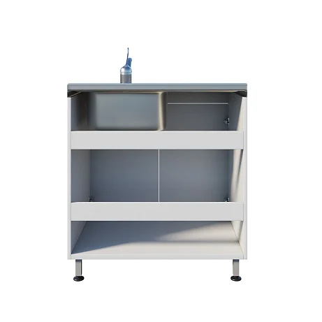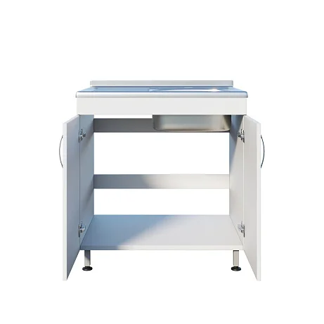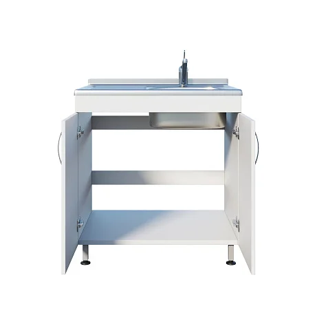 Мойка ММ 13.004 оснащена тумбой под мойкой с двумя распашными дверцами, что предоставляет удобное хранение необходимых материалов. Регулируемые по высоте ножки с винтовыми опорами позволяют корректировать уровень мойки на неровной поверхности, обеспечивая устойчивость и комфорт при использовании. Чаша с хирургическим локтевым смесителем и рабочей поверхностью устанавливаются сверху, что упрощает процесс работы.
