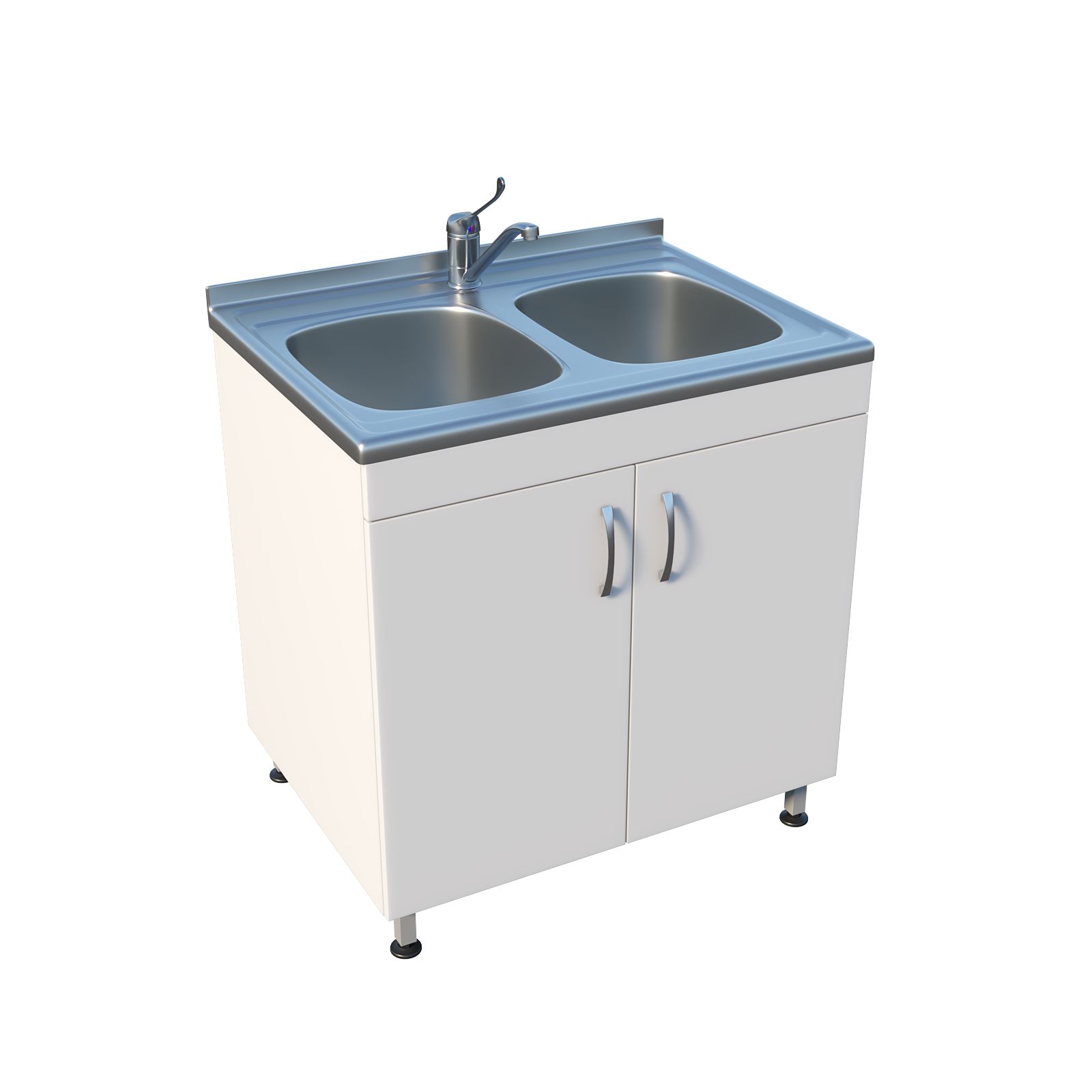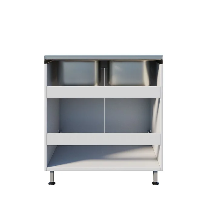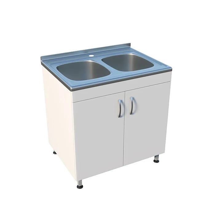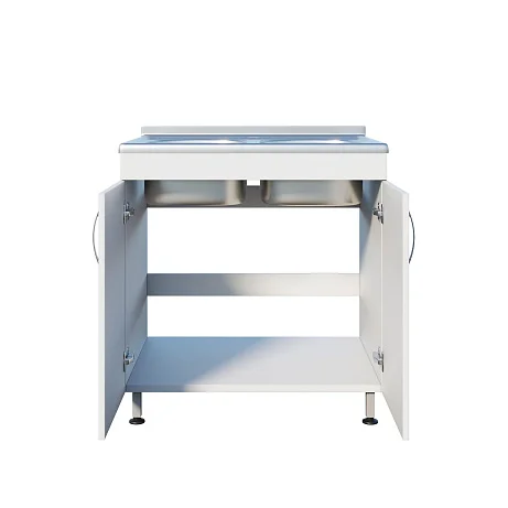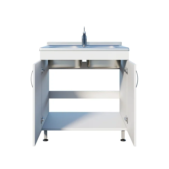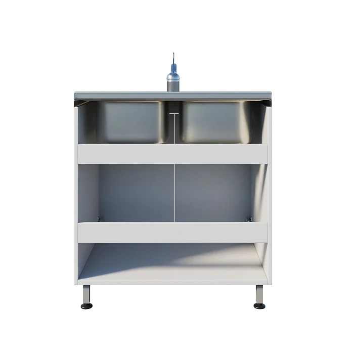 Мойка ММ 13.005 оснащена тумбой с двумя распашными дверцами, что обеспечивает удобное хранение необходимых инструментов и материалов. Регулируемые по высоте ножки с винтовыми опорами позволяют установить мойку на неровной поверхности, обеспечивая устойчивость и надежность. Две чаши со смесителем устанавливаются сверху, что делает работу более удобной и эффективной.