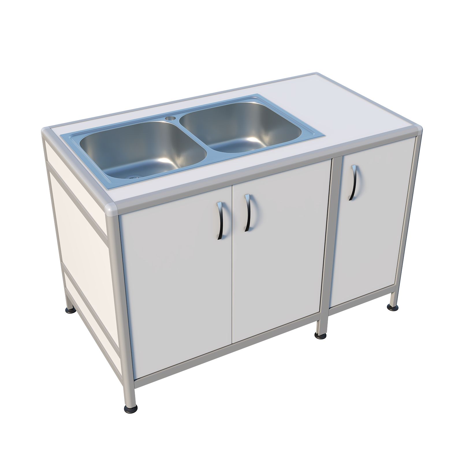 Медицинская мойка ММ 13.005al предназначена для оснащения лабораторий и других медицинских учреждений. Основу конструкции составляет алюминиевый каркас, заполнение - ЛДСП толщиной 8 мм. В верхней части установлена врезная двухчашевая мойка. Сбоку предусмотрена столешница, удобная для размещения посуды и других предметов. Под мойкой расположен отсек с двустворчатой распашной дверцей, а под столешницей — отделение с одной дверцей. Ножки оснащены опорами с регулировкой по высоте.