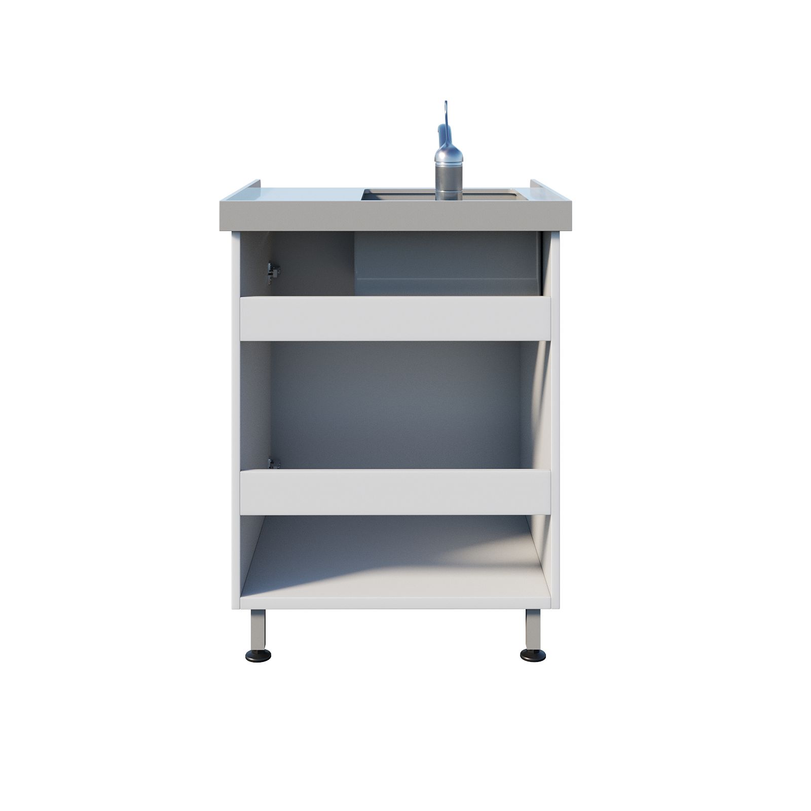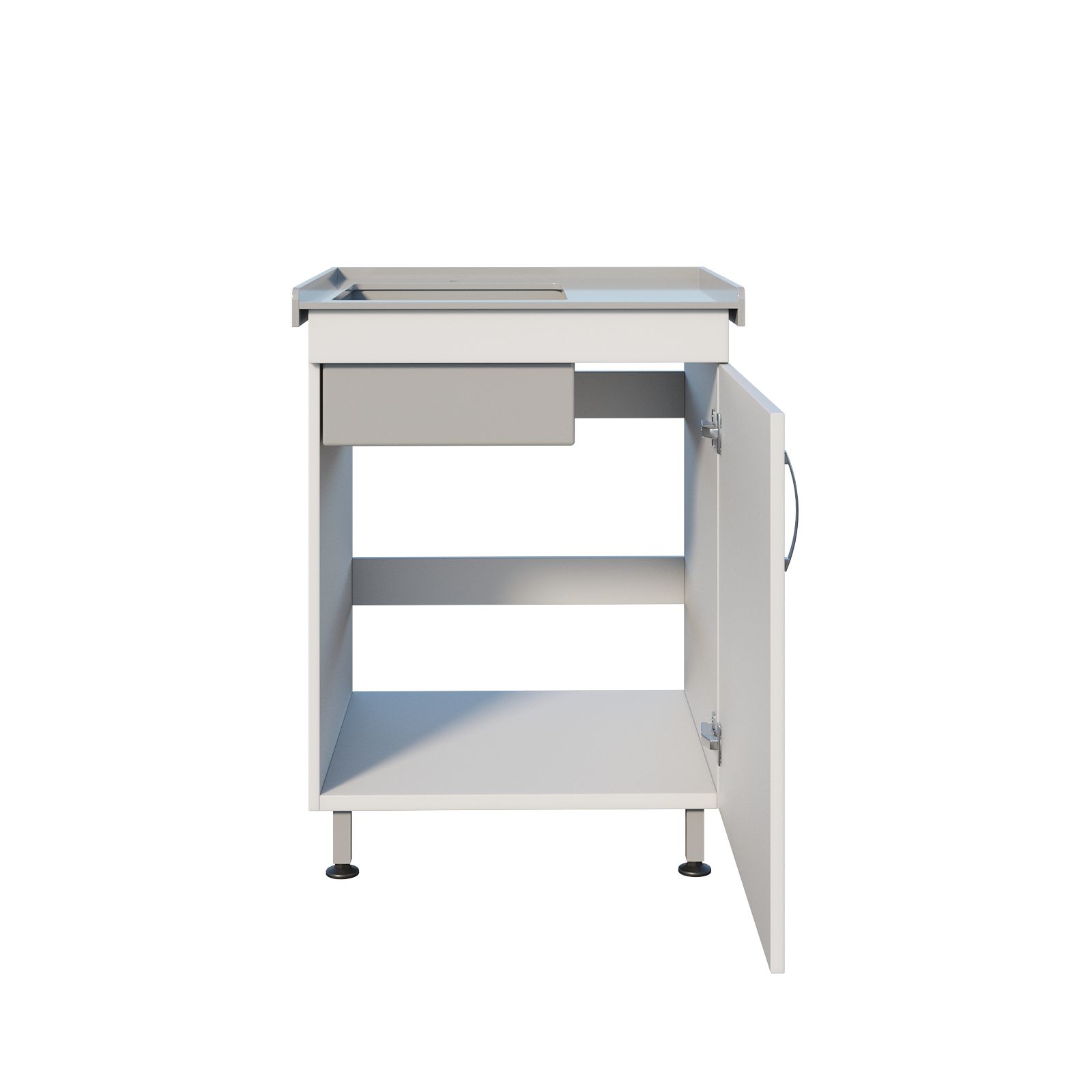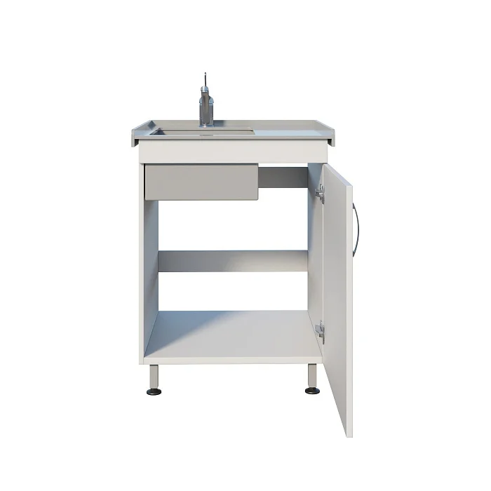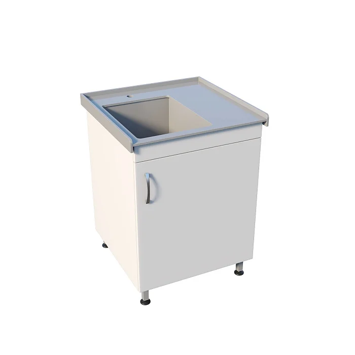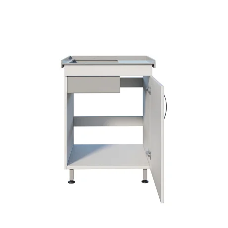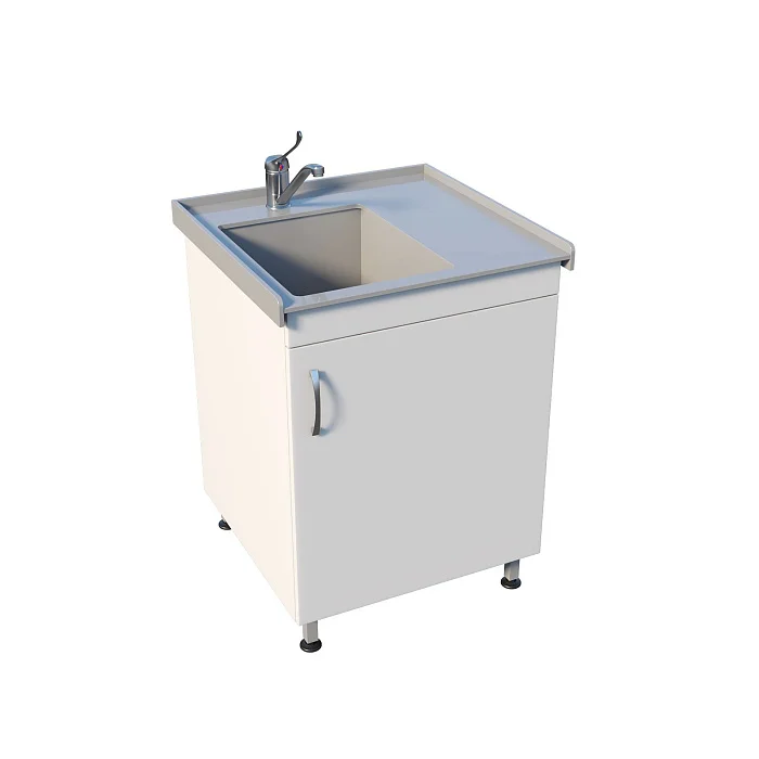 В основе — тумба из ЛДСП с распашной дверью: удобно хранить моющие средства, расходники, контейнеры или принадлежности для уборки (в рамках регламентов конкретного подразделения). Рабочая часть выполнена логично: накладная полипропиленовая мойка, борт по периметру и небольшая боковая рабочая зона — для кратковременного размещения инструментов, лотков или емкостей во время работы.