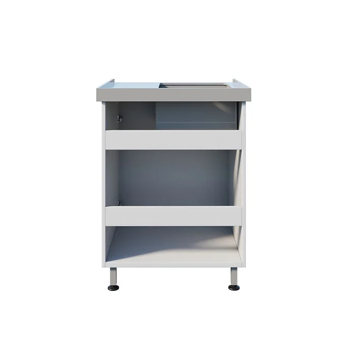 Корпус выполнен из ЛДСП, а накладная чаша — из полипропилена: материал устойчив к влаге и прост в уходе. Размер чаши 340×440×200 мм позволяет комфортно размещать большинство используемых изделий, а борт по периметру помогает держать рабочую зону чище. Сбоку предусмотрена небольшая рабочая поверхность для временного размещения инструментов и расходных материалов. Под мойкой тумба с распашной дверкой.