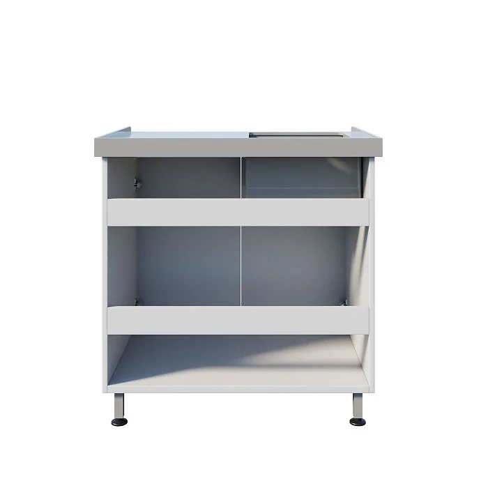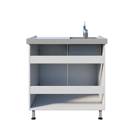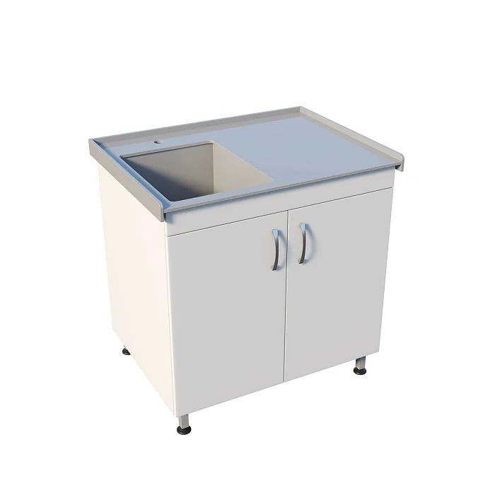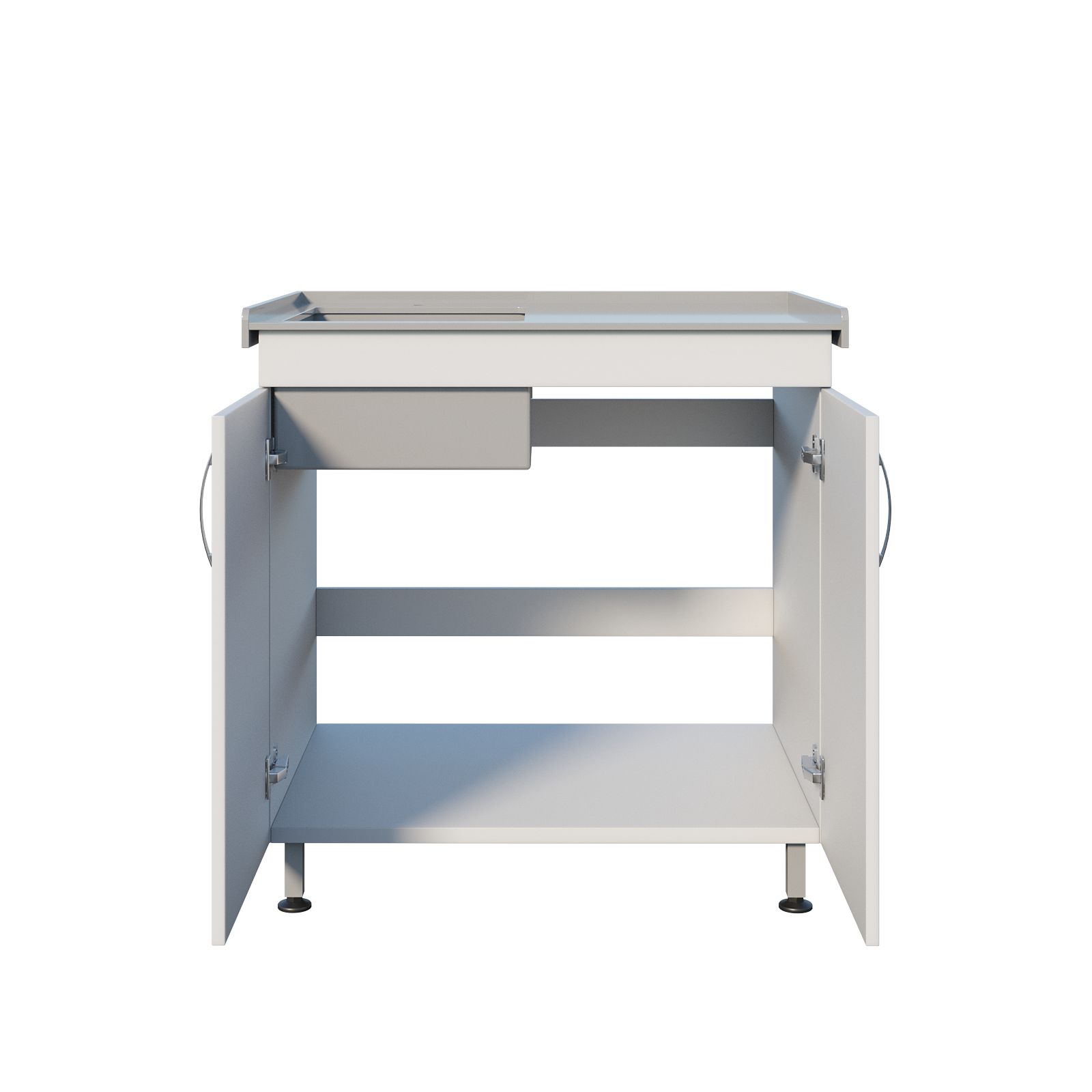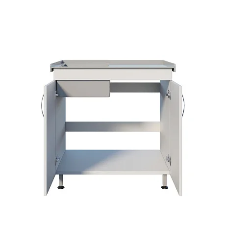 Основа мойки — тумба из ЛДСП с двумя распашными дверцами. Такое исполнение удобно для хранения расходных материалов, моющих средств, дезрастворов (в разрешенной таре) и инвентаря для уборки, когда важно держать рабочую поверхность свободной, а необходимое — под рукой.