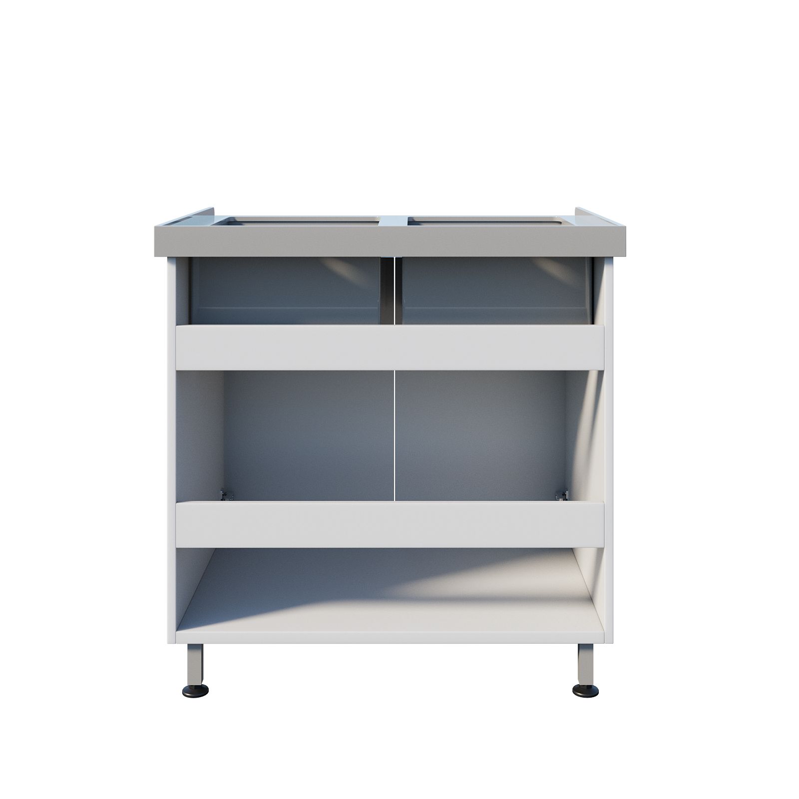 Основа мойки — тумба из ЛДСП, закрывающая коммуникации и организующая аккуратный внешний вид рабочей зоны. Две распашные дверцы обеспечивают доступ внутрь для обслуживания, размещения расходных материалов и подключения к водоснабжению/канализации. Все видимые кромки облицованы ПВХ‑лентой — это снижает риск повреждения торцов при регулярной уборке и повышает «живучесть» мебели в санитарных помещениях.