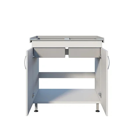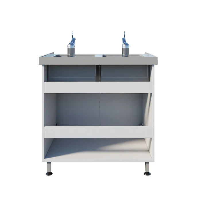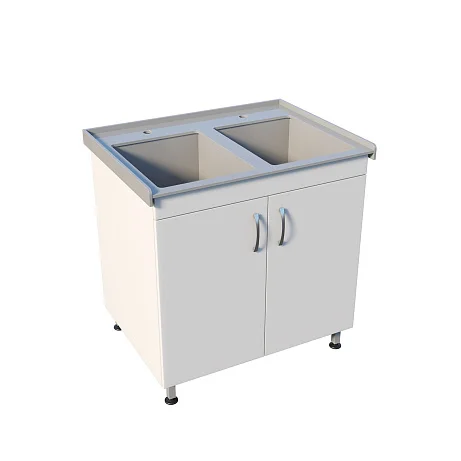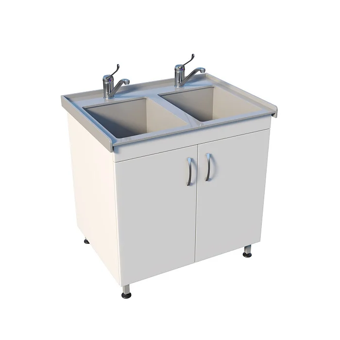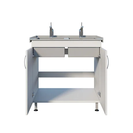 Тумба выполнена из ЛДСП и закрывается двумя распашными дверками — внутри удобно хранить расходники и всё необходимое под рукой. Сверху установлена накладная двухчашевая мойка из полипропилена: две чаши упрощают разделение процессов и ускоряют работу. Устойчивость обеспечивает сварной каркас-основание, а хирургические локтевые смесители делают использование максимально удобным и гигиеничным в условиях, где важна минимизация контакта руками.