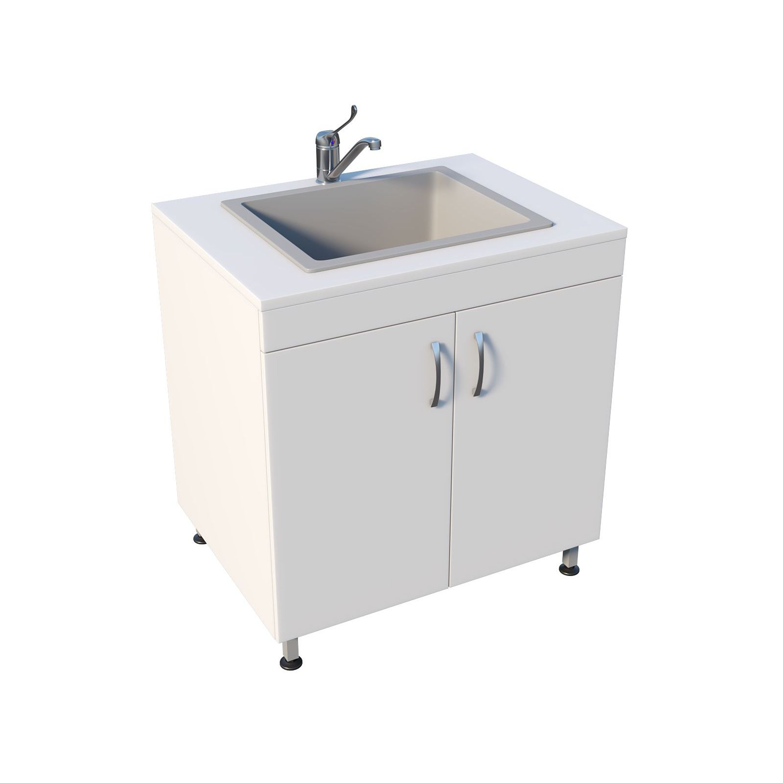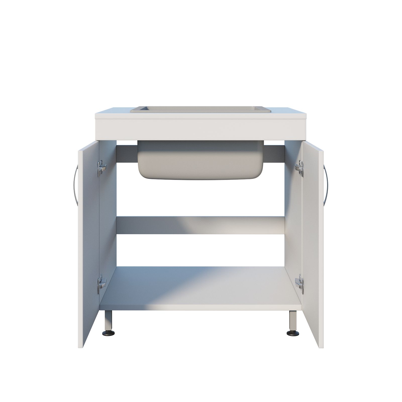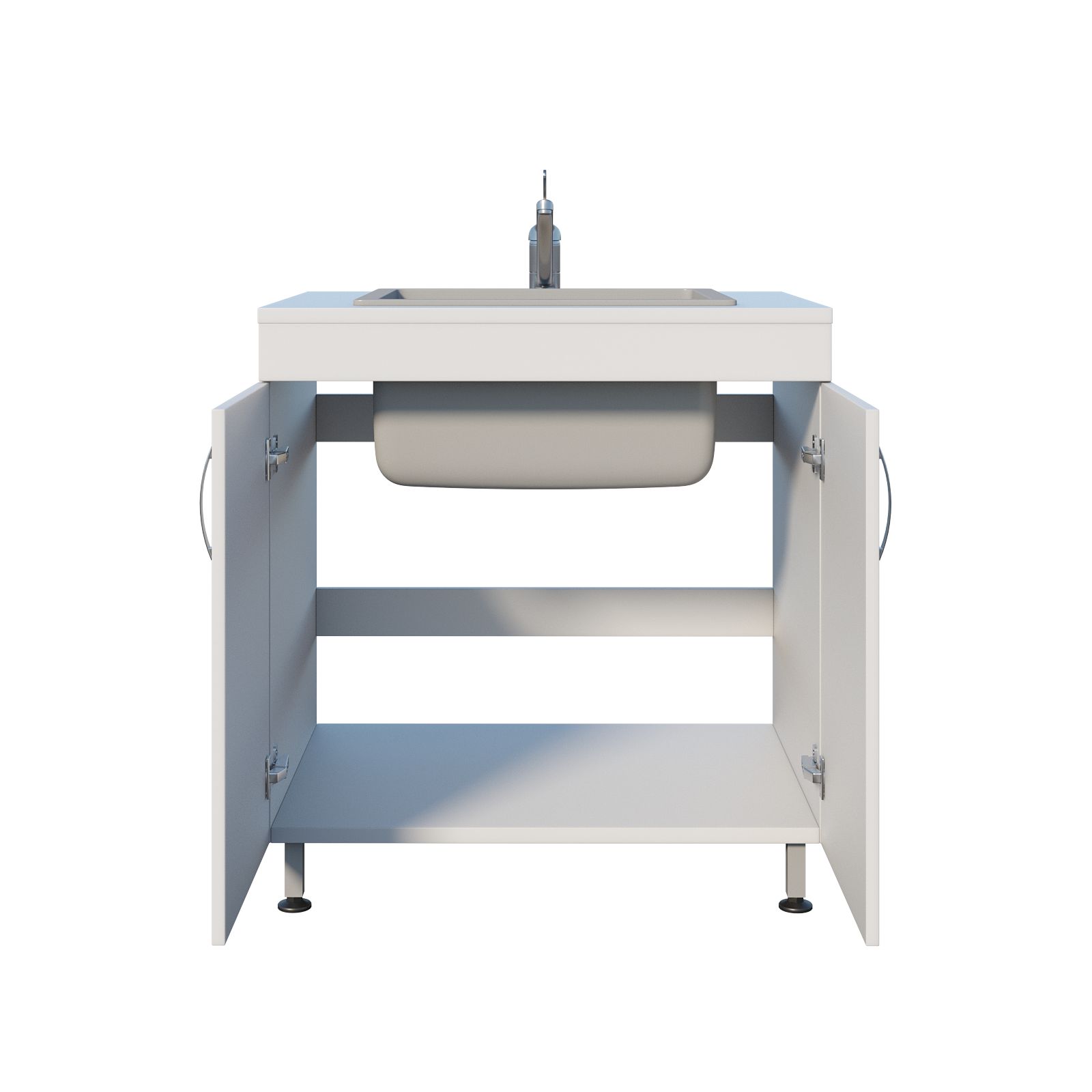 Основа мойки — тумба с корпусом и столешницей из ЛДСП. Такой формат привычен для медицинских учреждений: поверхность легко поддерживать в порядке, а внутри удобно хранить расходные материалы, моющие средства и инвентарь, не загромождая рабочую зону. Тумба закрывается распашными дверьми — содержимое защищено от брызг и визуального шума, что важно для аккуратного вида кабинета.