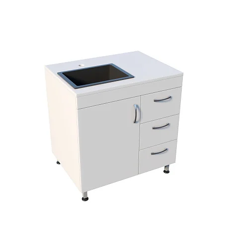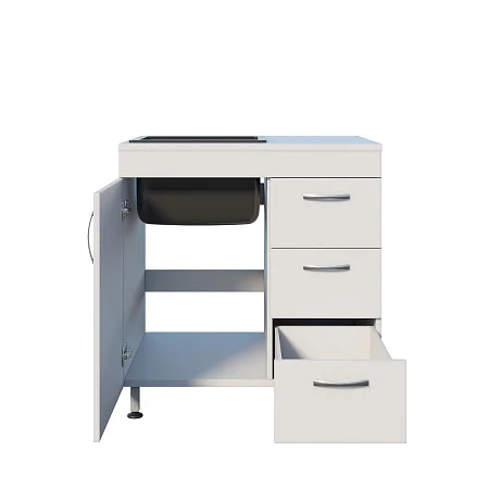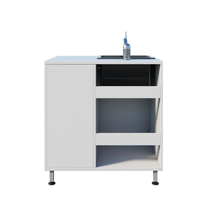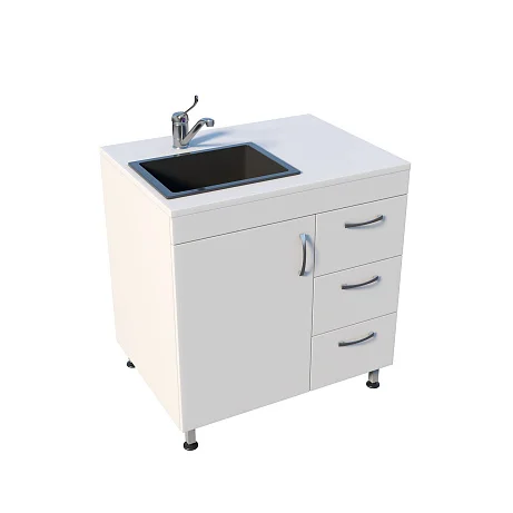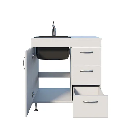 Корпус выполнен из ЛДСП, установлена врезная мойка Stegler. Внутреннее пространство продумано для хранения и мелкой рутины: распашная дверца и три одинаковых выдвижных ящика помогают держать под рукой всё необходимое и поддерживать порядок на рабочем месте. Рядом с мойкой, над ящиками расположена удобная рабочая поверхность. Основание — прочный сварной каркас на ножках, рассчитанный на интенсивную эксплуатацию. Для удобства в работе предусмотрен хирургический локтевой смеситель, позволяющий управлять подачей воды без лишних касаний.