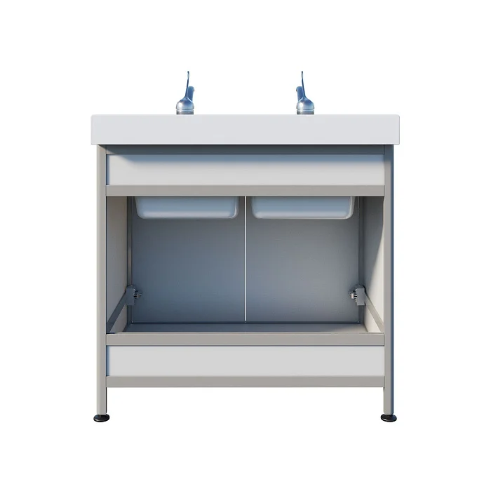 Для практичной эксплуатации предусмотрены хирургические локтевые смесители над каждой чашей — можно включать воду без лишних касаний, что особенно удобно при работе с инструментами и в условиях повышенных требований к гигиене.