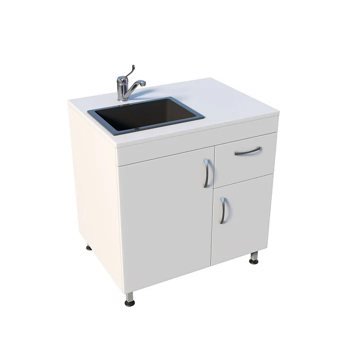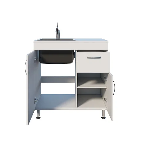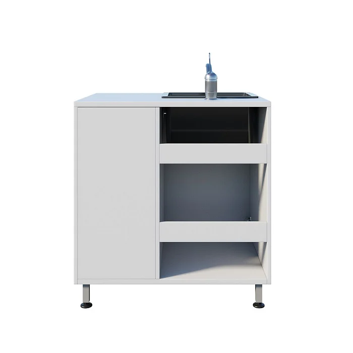 Корпус выполнен из ЛДСП, установлена врезная мойка Stegler. Рабочая поверхность расположена справа — удобно для размещения лотков, ёмкостей и подготовки инструментов к дальнейшим процедурам. Под раковиной предусмотрено отделение с распашной дверцей, рядом — секция с ящиком и дверцей, внутри которой есть полка для хранения.