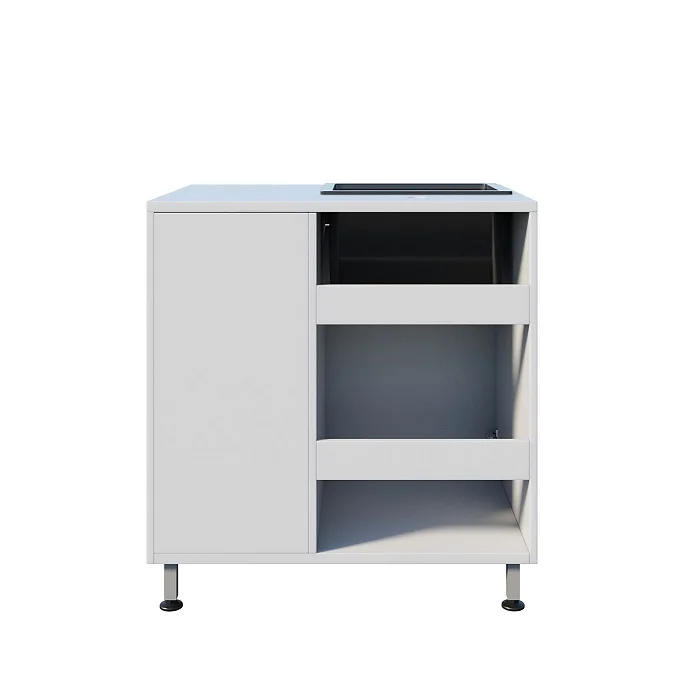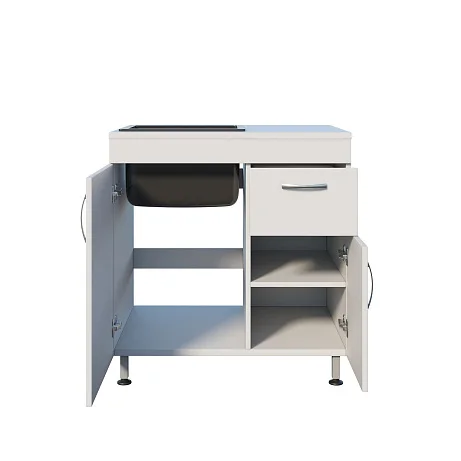 Под раковиной предусмотрено отделение с распашной дверцей — удобно для размещения расходников и принадлежностей, которые должны быть рядом, но не на столешнице. Рядом расположено отдельное отделение с ящиком и дверцей; внутри — полка, на которой удобно разложить ёмкости, упаковки, контейнеры или средства, используемые по регламенту учреждения.