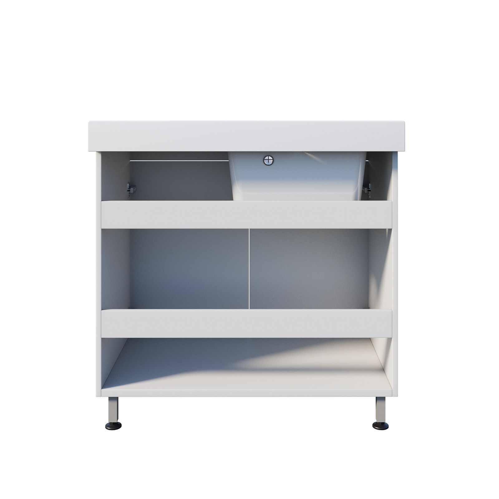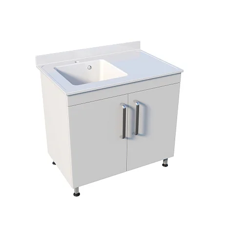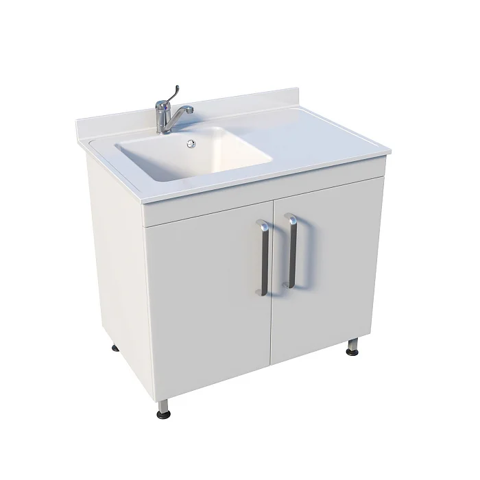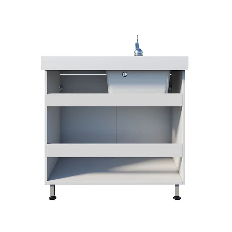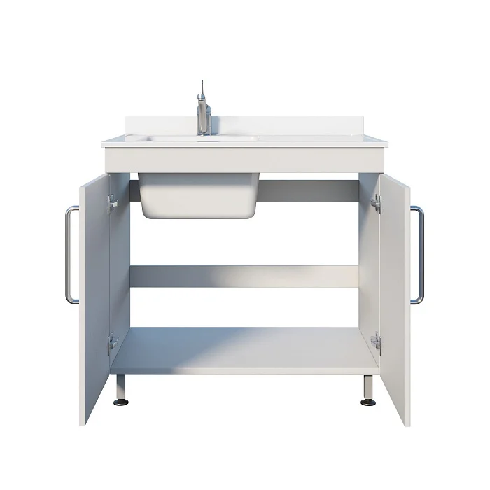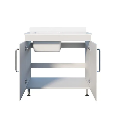 Корпус выполнен из ЛДСП, чаша мойки с рабочей поверхностью — из литьевого мрамора, устойчивого к интенсивной эксплуатации. Под мойкой предусмотрено закрытое отделение с двумя распашными дверцами — удобно для хранения расходников и инвентаря, чтобы рабочее место оставалось аккуратным. Ножки выполнены в виде сварного каркаса, что добавляет устойчивости. В комплекте используется хирургический локтевой смеситель — решение, которое помогает соблюдать гигиену и упрощает работу персонала.