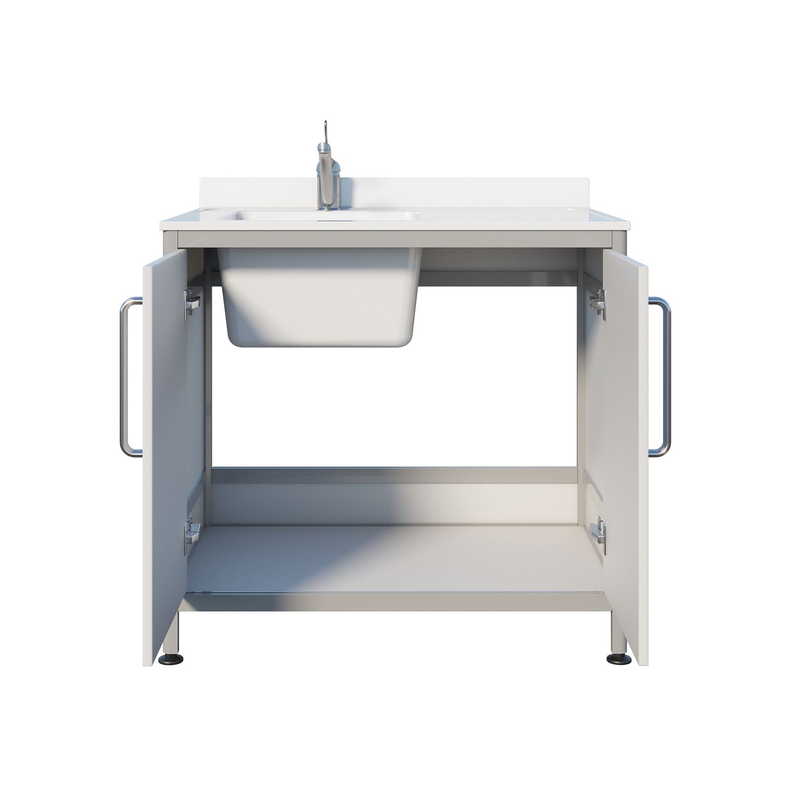 Подстолье — пластиковый корпус тумбы с двумя распашными дверцами. Это простой и понятный формат: внутри удобно хранить моющие растворы, расходные материалы, салфетки, перчатки или принадлежности для санитарной обработки, не загромождая столешницу. Дверцы закрывают содержимое от брызг и визуального «шума», а в помещении поддерживается более аккуратный вид рабочей зоны.