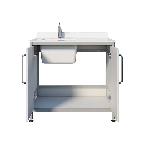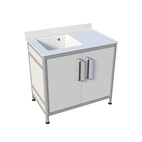 Основа конструкции выполнена из алюминиевого профиля с пластиковым заполнением, что делает изделие легким в обслуживании и подходящим для регулярной санитарной обработки. Накладная мойка дополнена рабочей поверхностью справа из литьевого мрамора — удобно разместить инструменты, емкости и расходные материалы в зоне под рукой. Тумба закрывается двумя распашными дверцами, позволяя хранить необходимое, не загромождая рабочее место. Ножки являются продолжением алюминиевого профиля, а хирургический локтевой смеситель помогает работать гигиенично, не отвлекаясь на лишние движения.