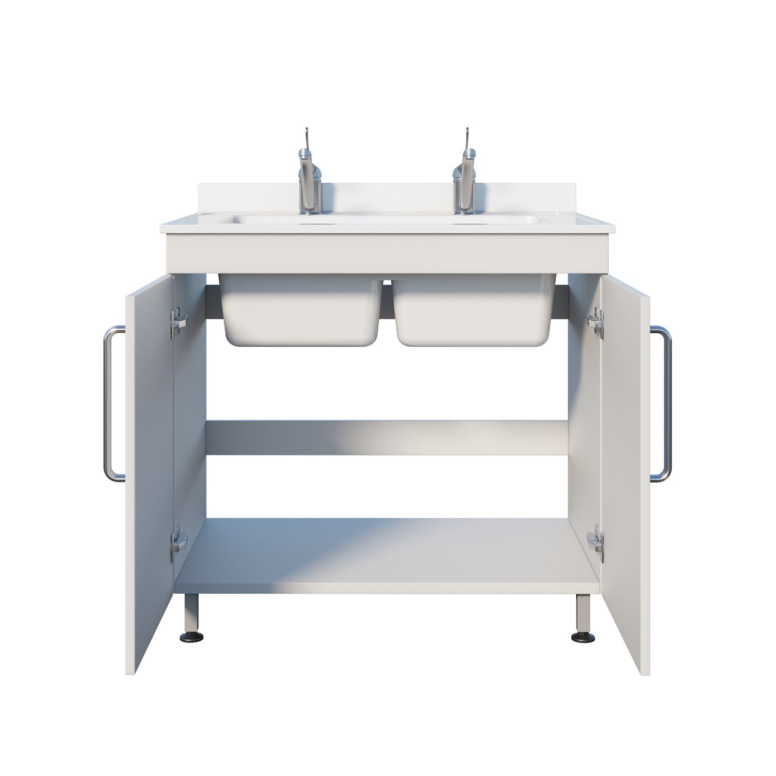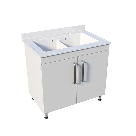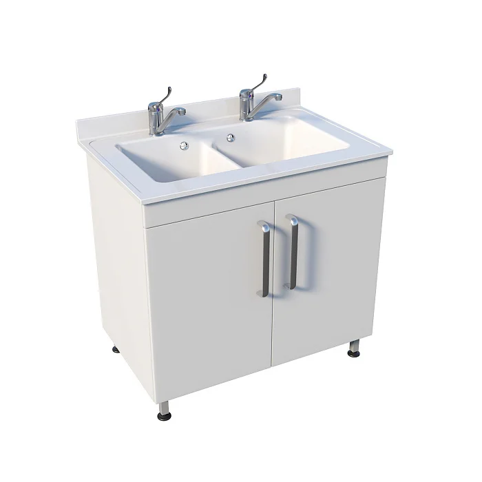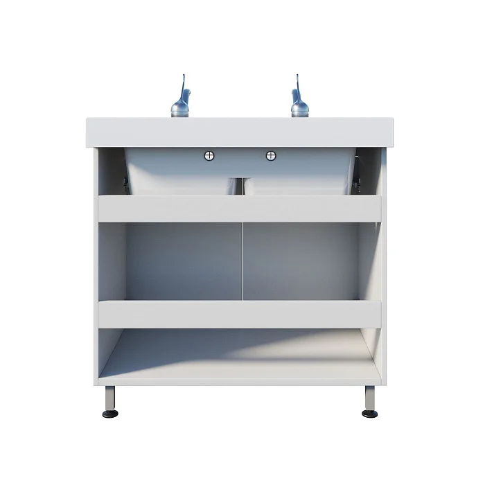 Корпус выполнен из ЛДСП, а сама мойка — из литьевого мрамора: материал рассчитан на регулярное использование и аккуратный уход. Под чашами предусмотрено закрытое отделение с двумя распашными дверцами — всё необходимое можно хранить рядом, не загромождая рабочее пространство. Устойчивость обеспечивает сварной каркас на ножках, а локтевые хирургические смесители над каждой чашей упрощают работу и помогают соблюдать гигиенические требования.