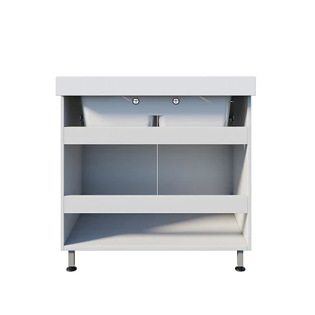 Подстолье закрывается двумя распашными дверцами — удобно хранить расходные материалы и инвентарь для мойки, а главное, визуально поддерживать чистоту: все нужное под рукой, но рабочая зона выглядит опрятно и организованно.